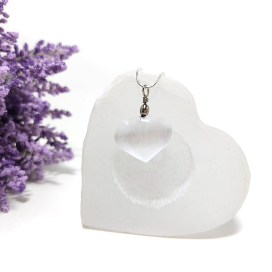 Selenite Heart Gift Set Heart Candle Holder and Selenite Heart Pendant Necklace