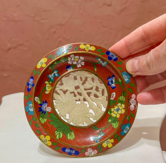 Vintage Chinese Cloisonne and Jade Carved Center Dish Trinket and Ginger Jar Vase
