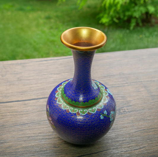 Vintage Blue Chinese Floral Cloisonné Enameled Vase - 8.5" Tall