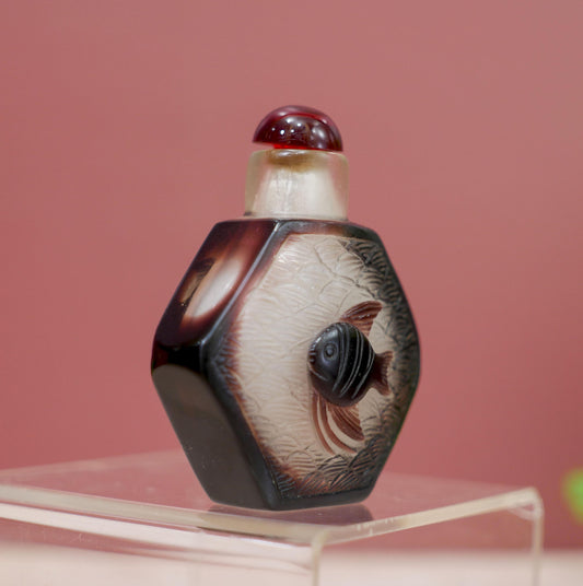 2.5" Vintage Chinese Peking Glass Overlay Carved Snuff Bottle - Brown Fish Design