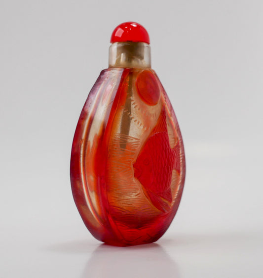 3" Snuff Bottle | Vintage Chinese Peking Glass Carved Snuff Bottle - Phoenixes & Fish