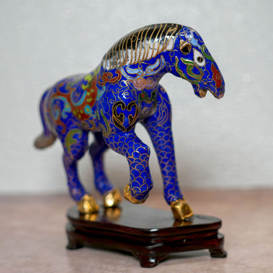 Vintage Chinese Cloisonné Horse Figurine Statue Enameled Brass On Wooden Base - 5.5" Long