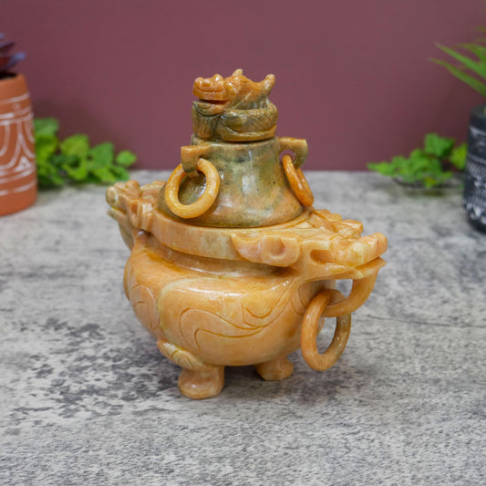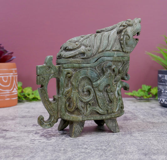Hand Carved Chinese Jade Foo Dog Ritual Gong Wine Vessel with Removable Lid - 7" Tall