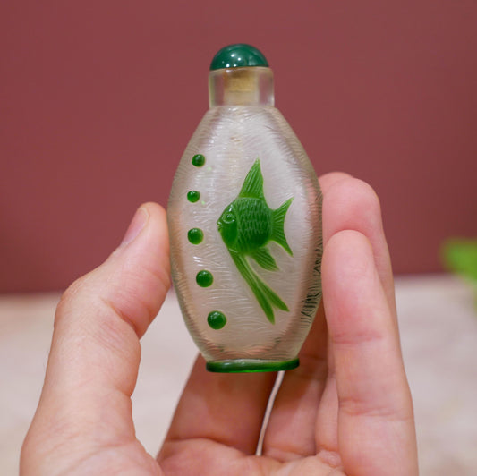 3" Vintage Chinese Peking Glass Overlay Carved Snuff Bottle - Green Fish Design