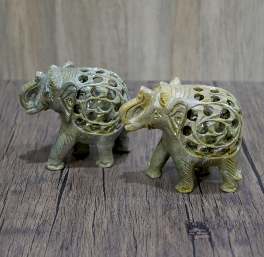 Hand Crafted Elephant Trunk Up Statue | Natural Soapstone Good Fortune Elephant w/baby Home Decor - 7" Long