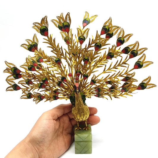 Peacock Cloisonne Sculpture Enamel Filigree Feathers Jade Green Base Statue 10"
