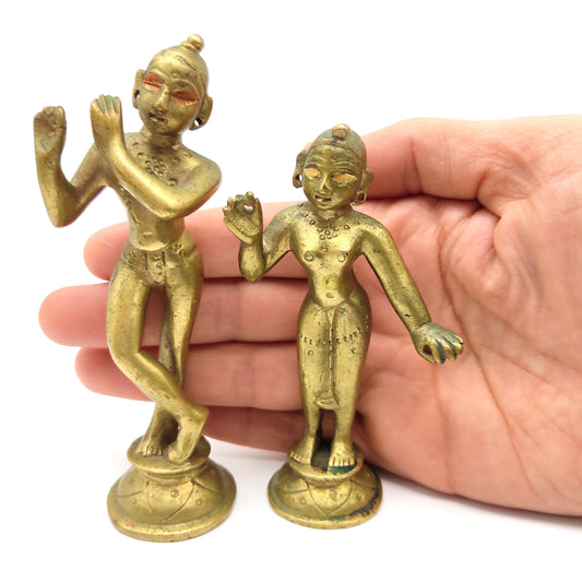 Antique Brass India Gods Sri Radha-Krishna On Lotus Deities Statue Murti Idols Set