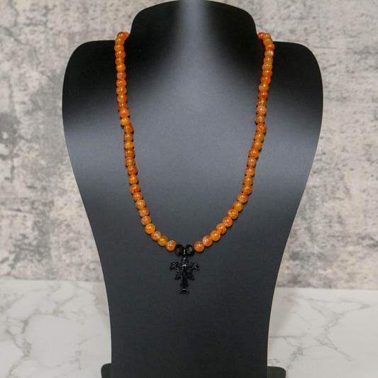 Moonstone Beads Mala Necklace with Gold Plated Crucifix Pendant 31" Handmade