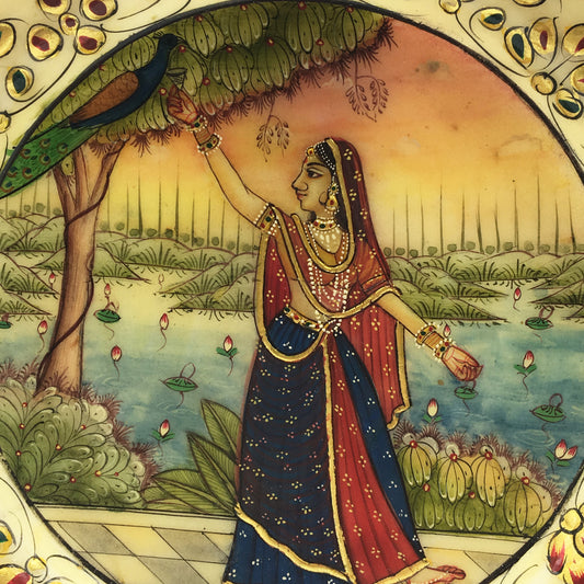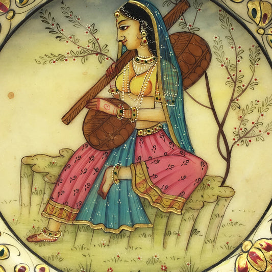 Hand-painted Collectible India Decorative Marble Plate with Wood Stand-Gold Trim