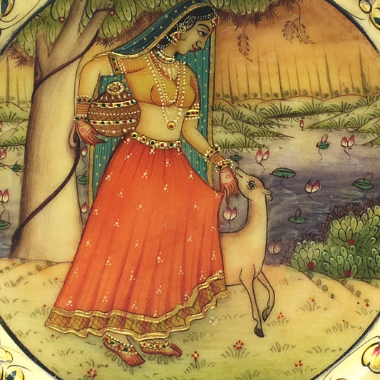 Handcrafted Collectible India Decorative Marble Plate with Wood Stand -Gold Trim