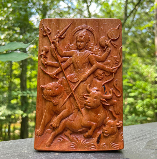 Standing Durga Maa Mahishasura Cherry Wood Carving Relief | Warrior Goddess
