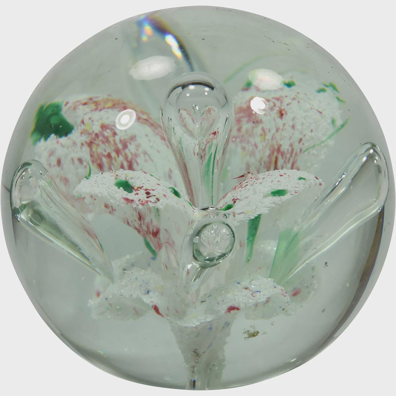 Beautiful vintage round art glass paperweight featuring an internal floral design with green stems and pink-white petals, encased within a clear dome-shaped body. Lovely overall pre-owned condition.