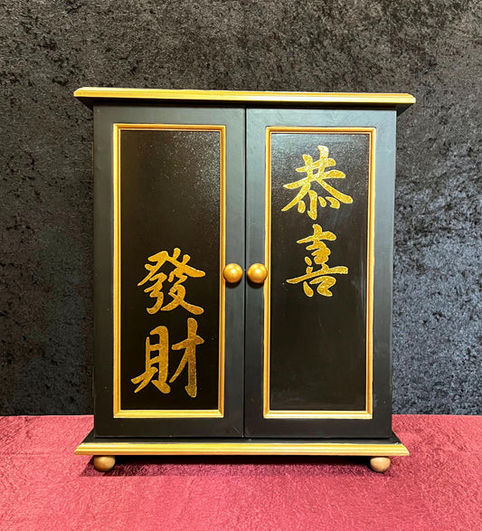 17" Vintage Chinese Lacquered Wooden Cabinet | Gold Calligraphy - New Year Prosperity Wishes
