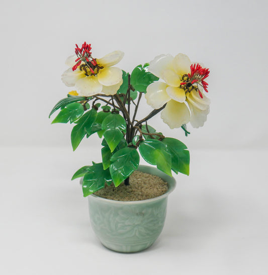 Vintage Chinese Jade Glass Bonsai Tree in Celadon Pot Floral Sculpture Decor
