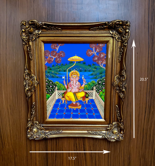 Ganesha Hand Painting Art in Baroque Rococo Golden Frame - India Wall Decor