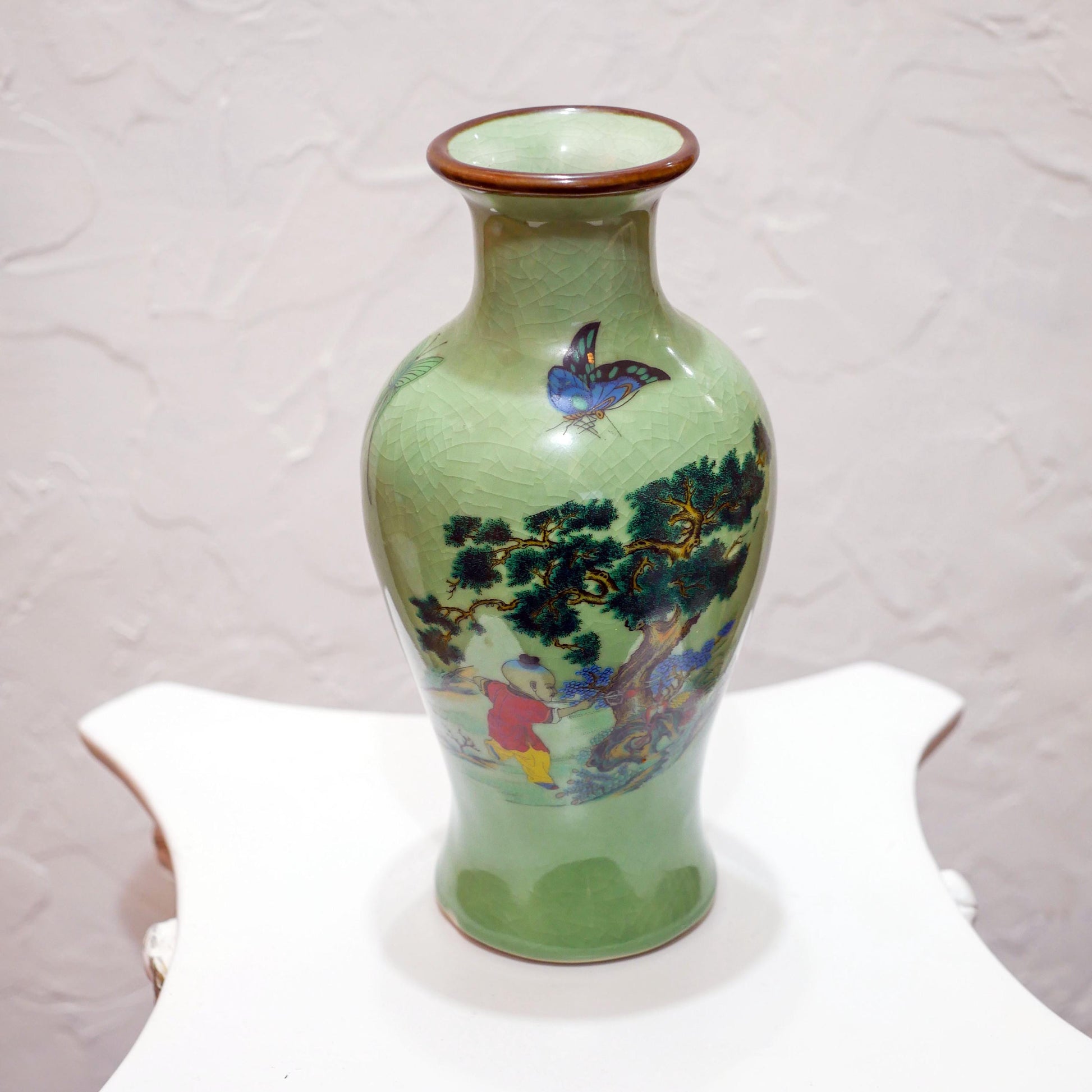 Vintage Chinese Celadon Crackled Glazed Ceramic Hand Painted Amazing Detailed Scenery Asian Children in Nature - Home Decor Collectible Vase with Lots of Lovely Detail .