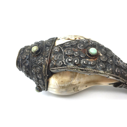 Conch shell Trumpet Mahakala Silver Repousse Gemstones Tibet 20th century