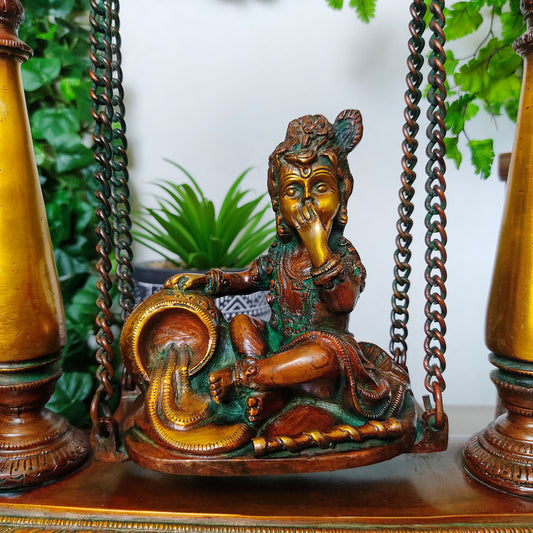 Vintage Baby God Krishna Butter Thief Brass Swing Statue With Bells - 16" Tall