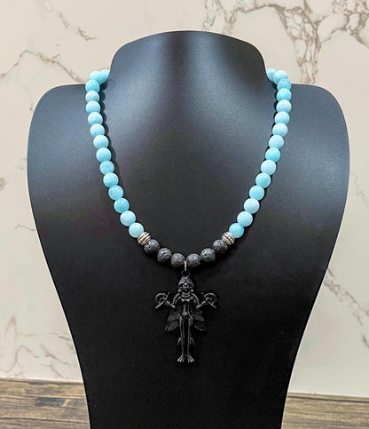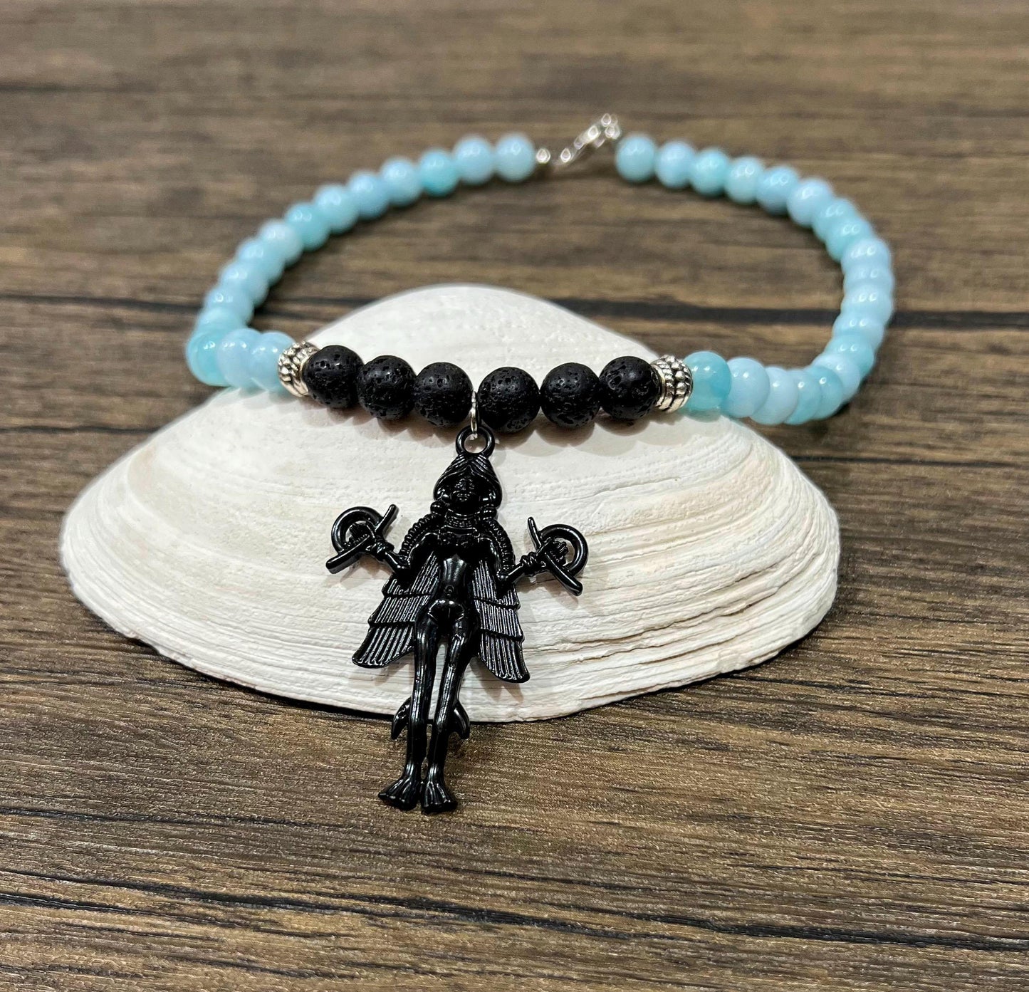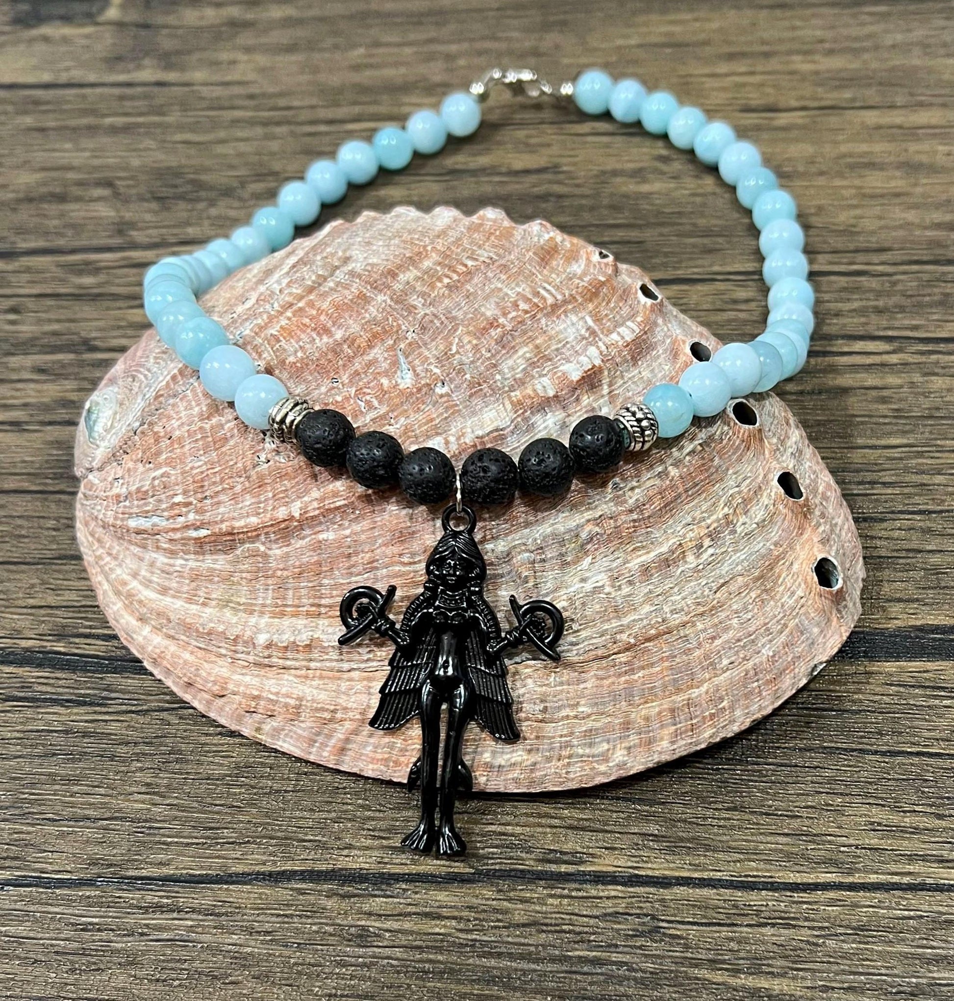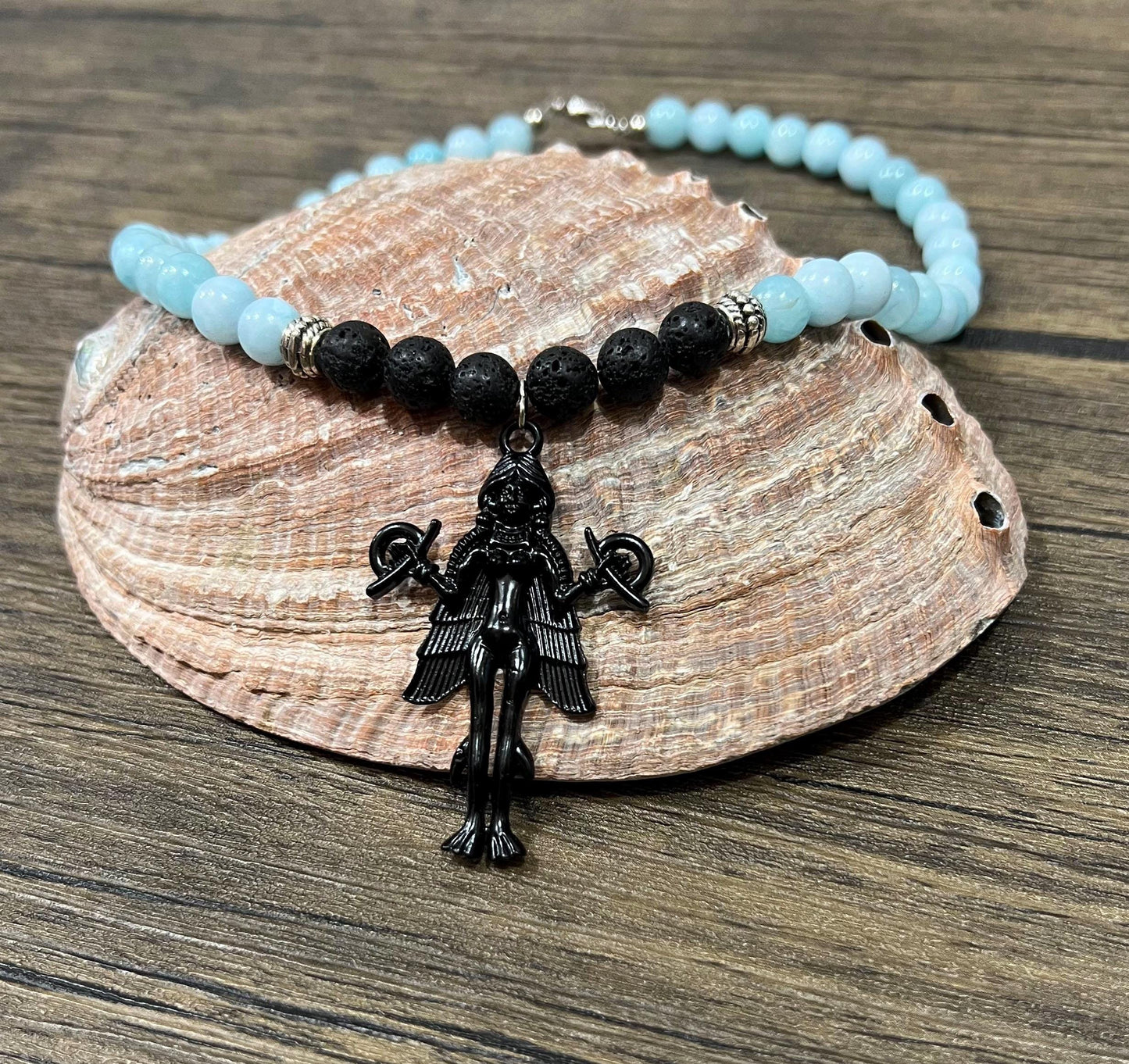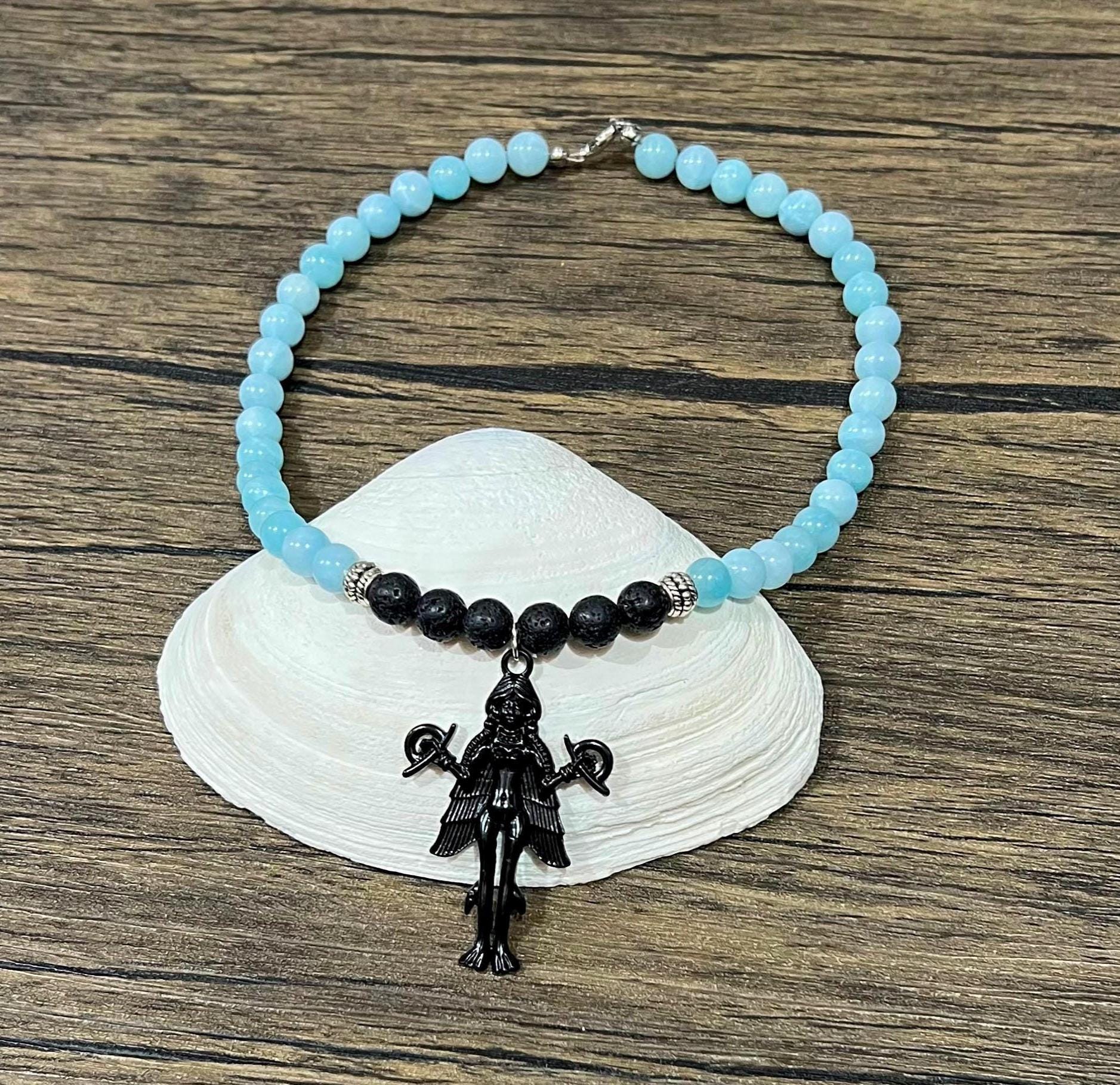 This handmade, one of a kind, Lilith necklace features a genuine Aquamarine gemstone, a stone of balance, communication, and healing. Inspired by Mesopotamian mythology, Lilith symbolizes strength, feminine power, and rebellion against limitations.