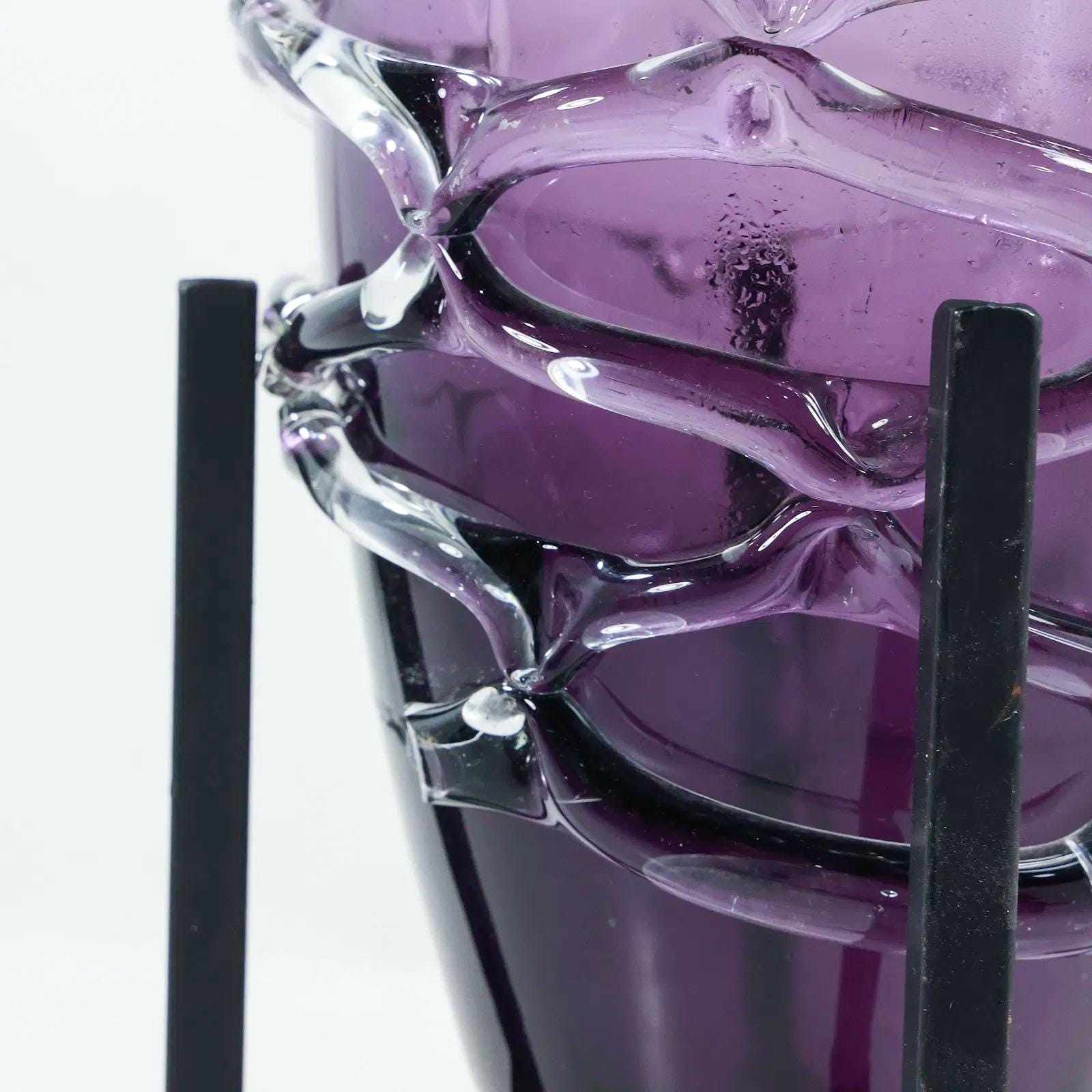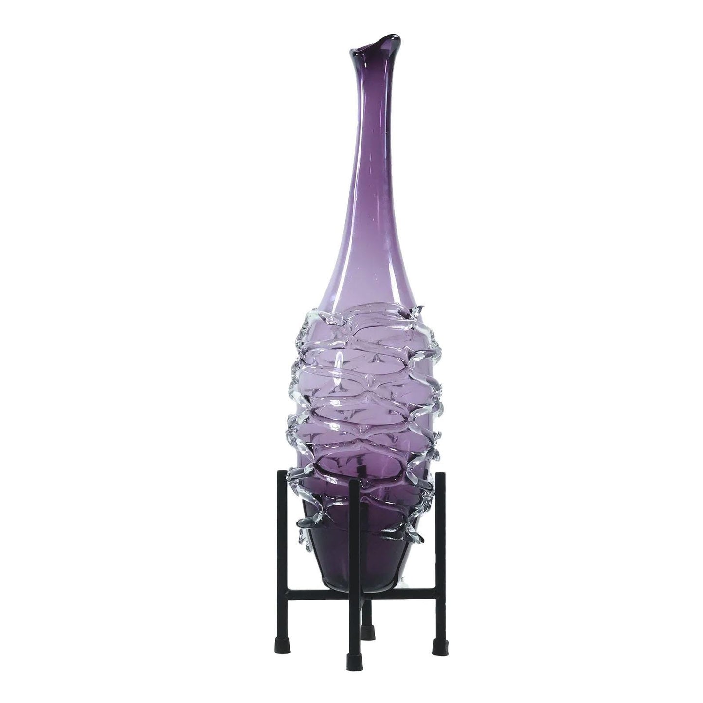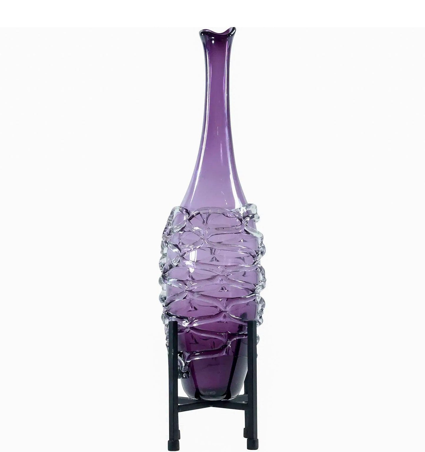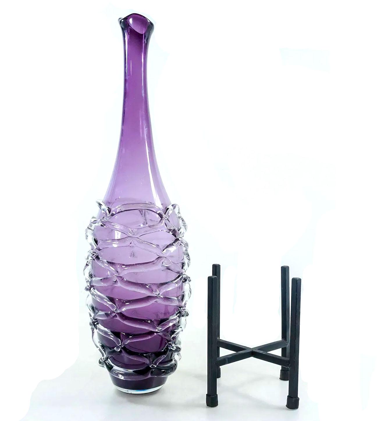 22" Tall (stands 24" in stand) This is a gorgeous vintage murano-style handblown tall purple glass vase with clear glass trailing. the vase rests securely in a custom black metal stand, enhancing its sculptural appeal and making it a true showpiece for any room