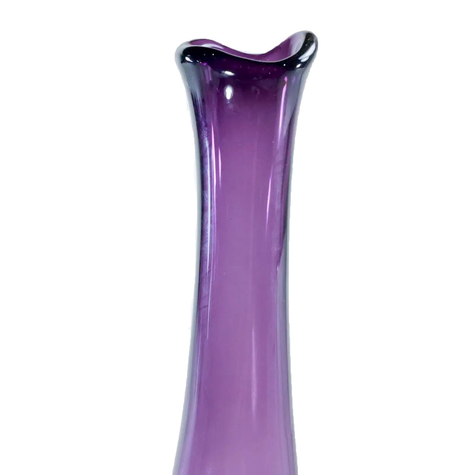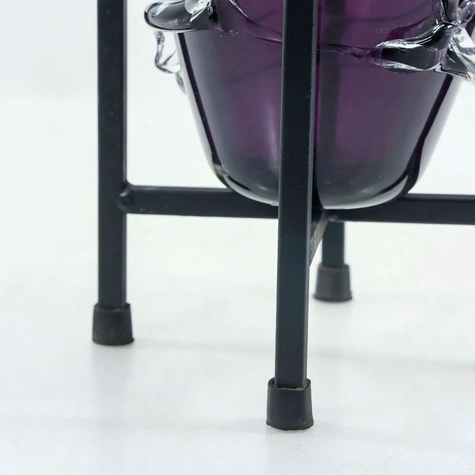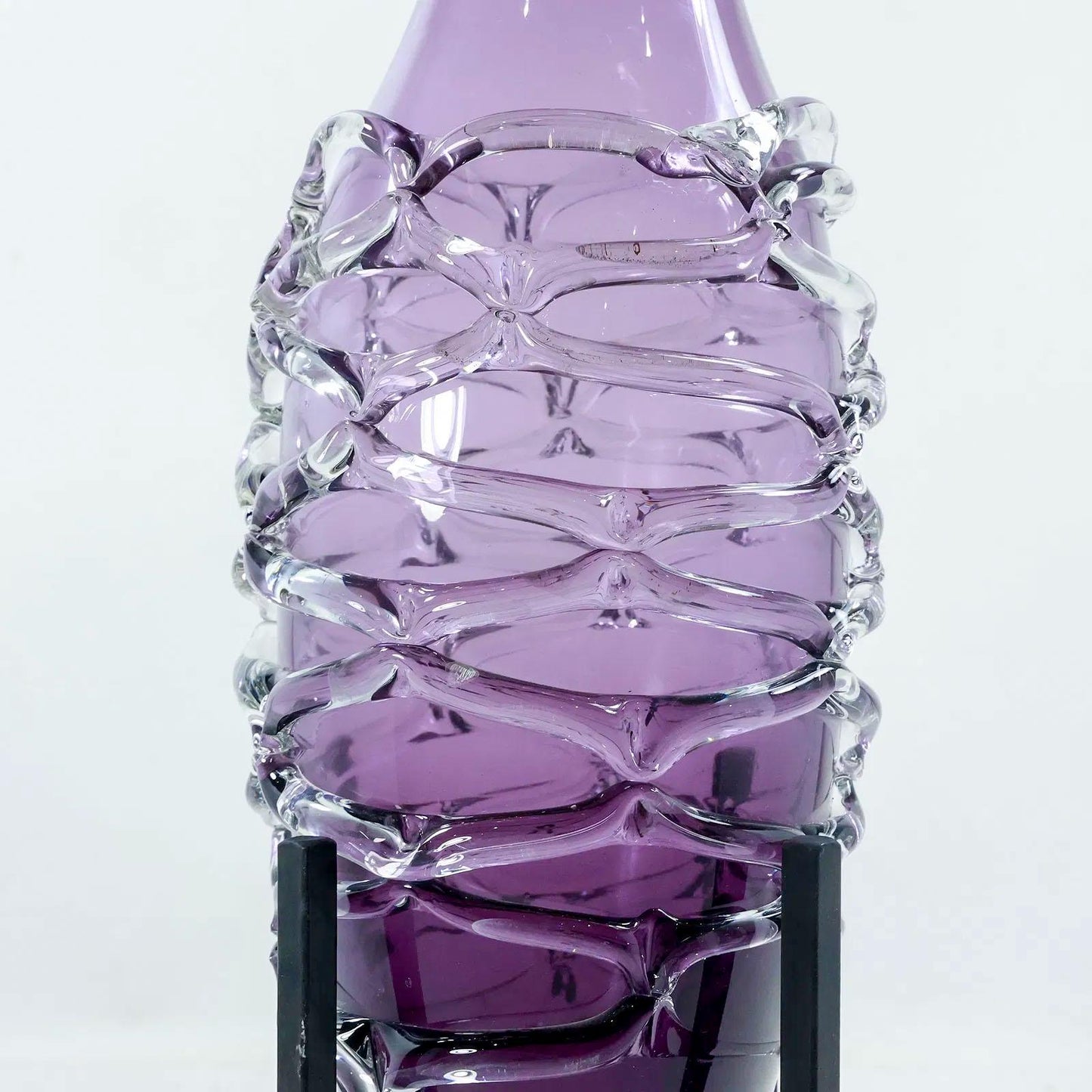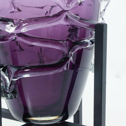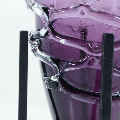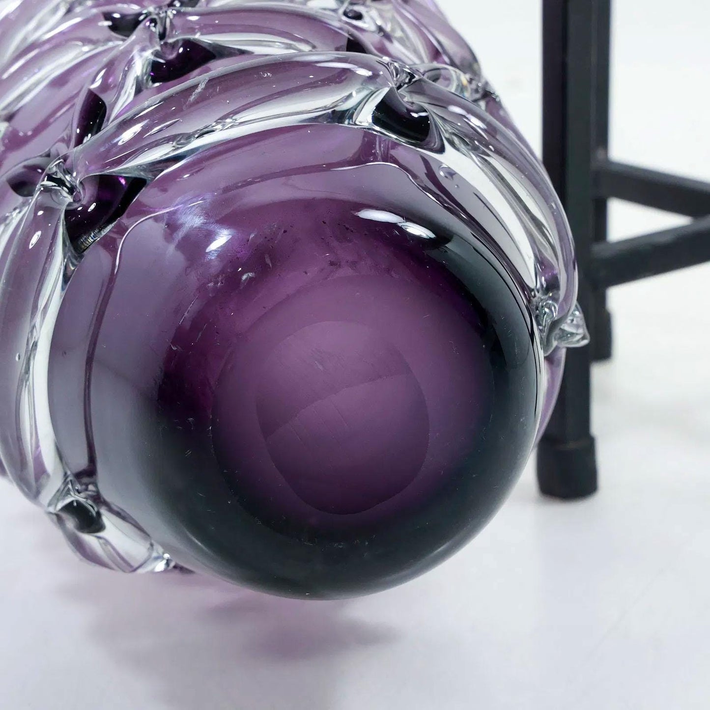 22" Tall (stands 24" in stand) This is a gorgeous vintage murano-style handblown tall purple glass vase with clear glass trailing. the vase rests securely in a custom black metal stand, enhancing its sculptural appeal and making it a true showpiece for any room