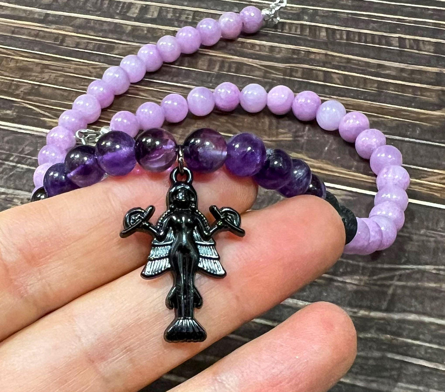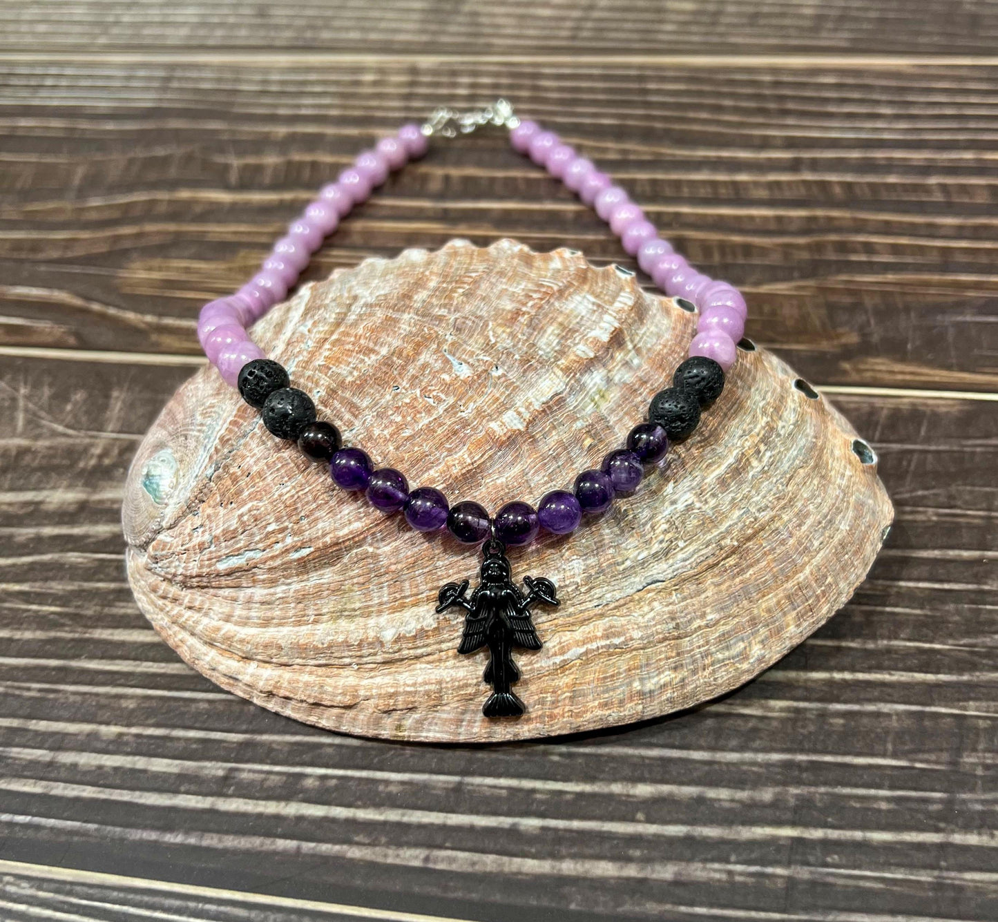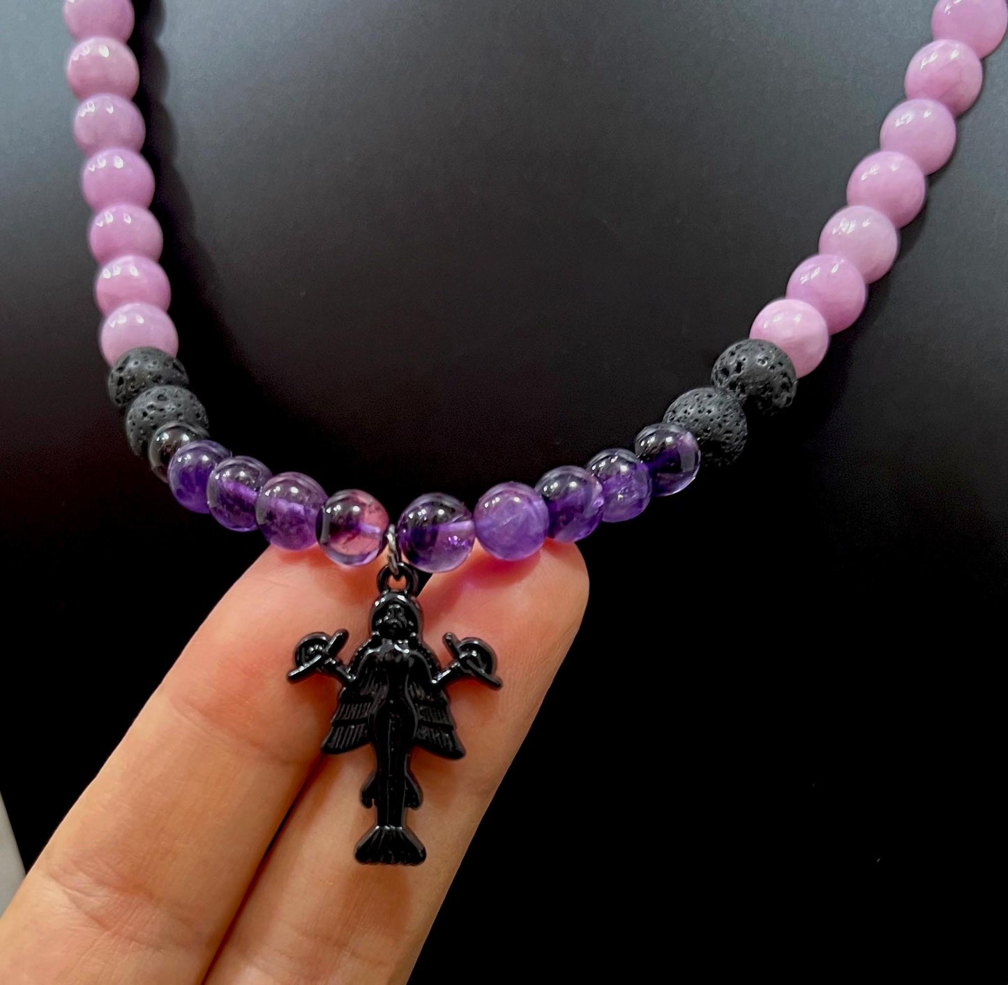 This one-of-a-kind handmade Lilith necklace features kunzite, amethyst, and black lava beads, chosen for their rich symbolism and quietly powerful presence. Inspired by Mesopotamian mythology, Lilith symbolizes strength, feminine power, and rebellion against limitations.