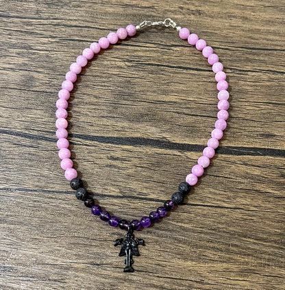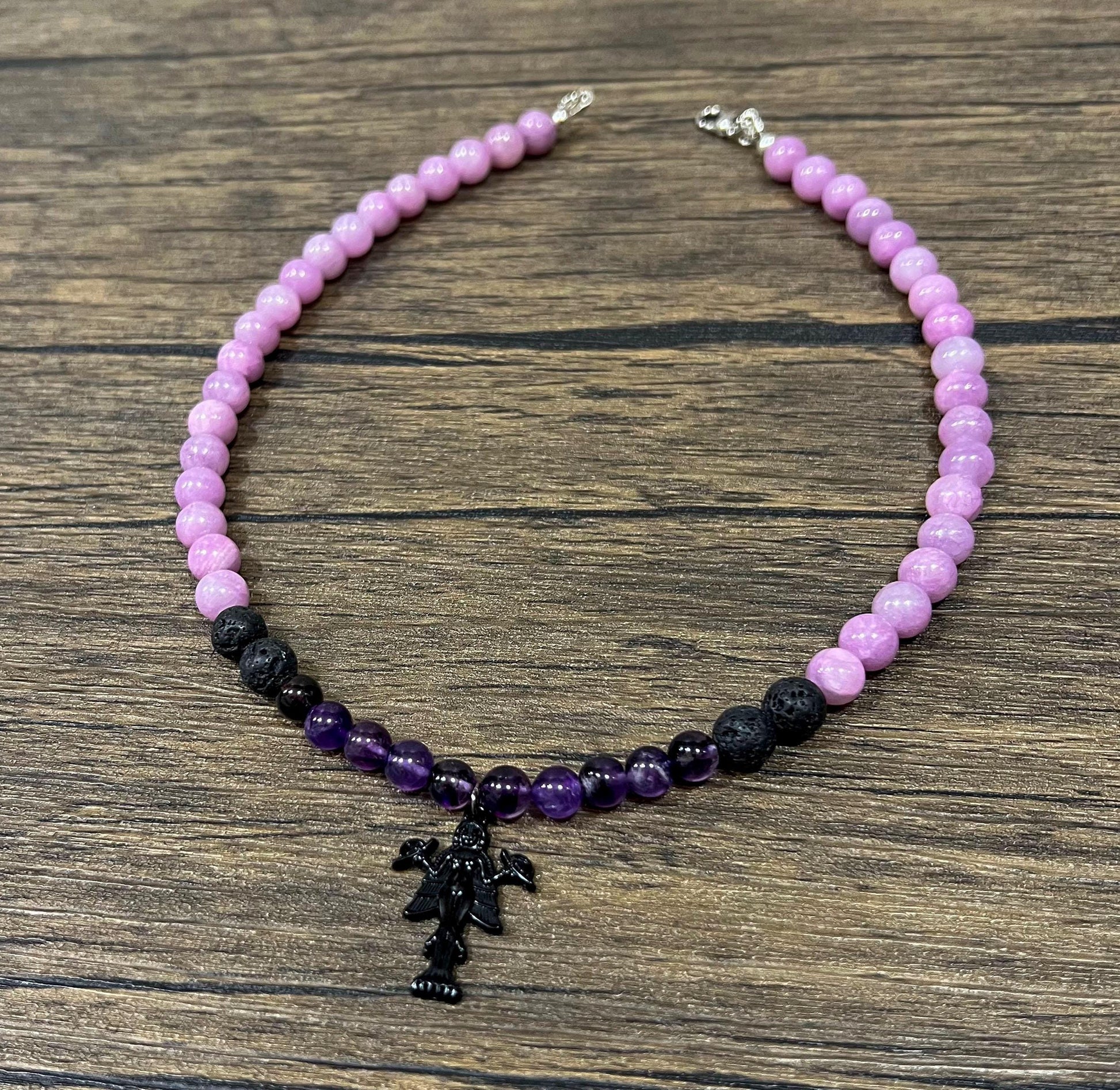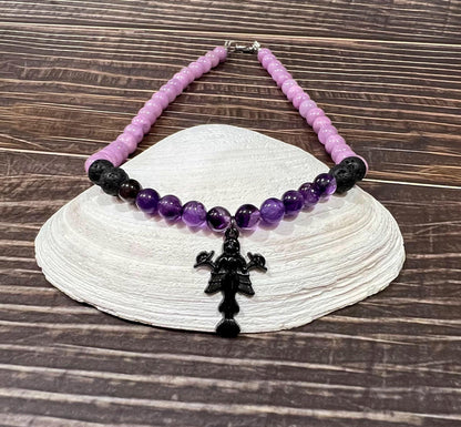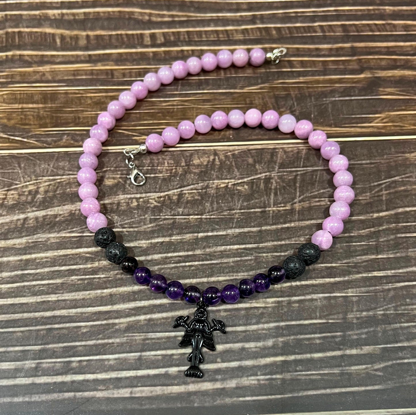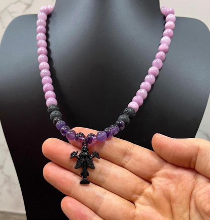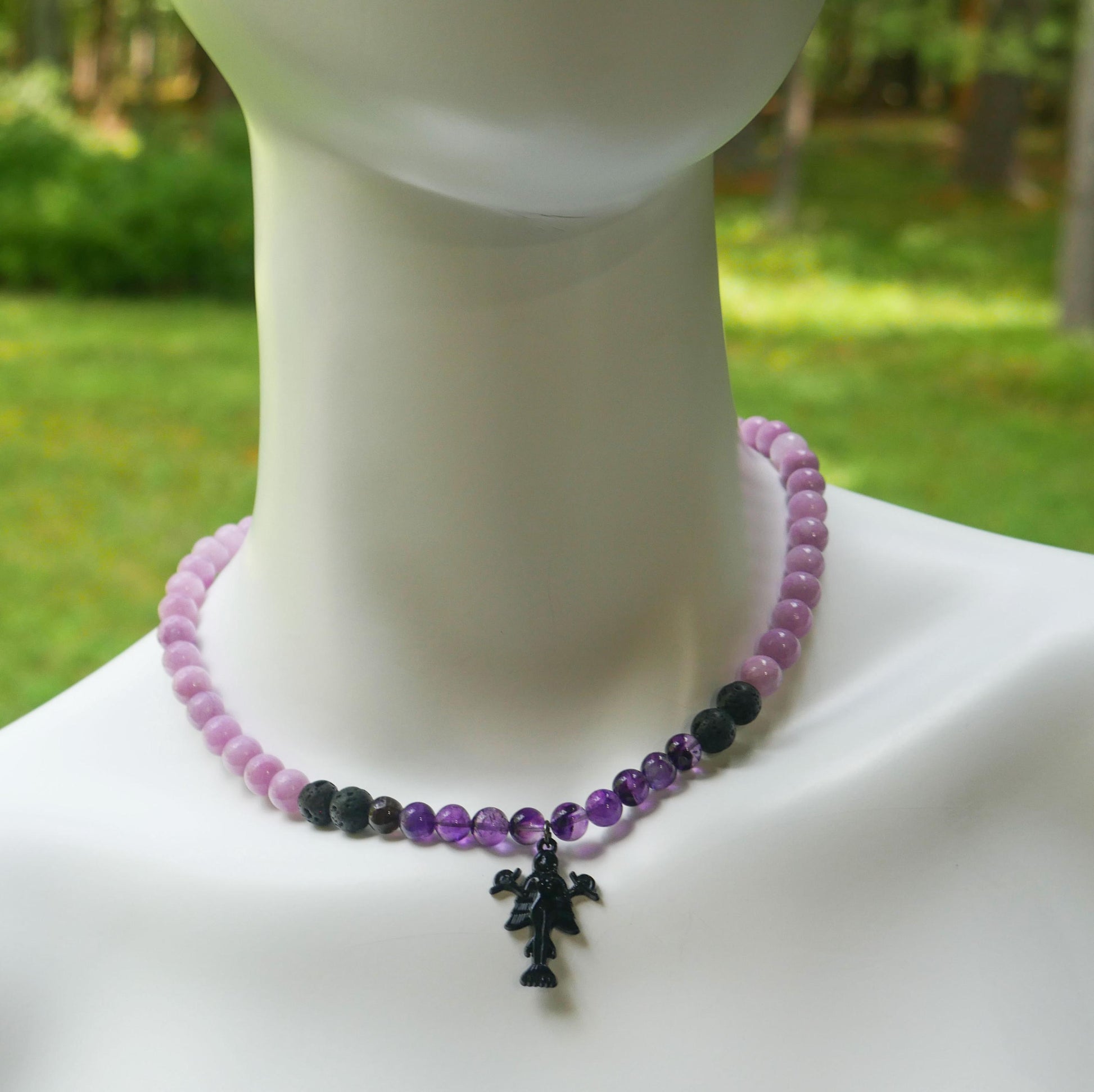 This one-of-a-kind handmade Lilith necklace features kunzite, amethyst, and black lava beads, chosen for their rich symbolism and quietly powerful presence. Inspired by Mesopotamian mythology, Lilith symbolizes strength, feminine power, and rebellion against limitations.