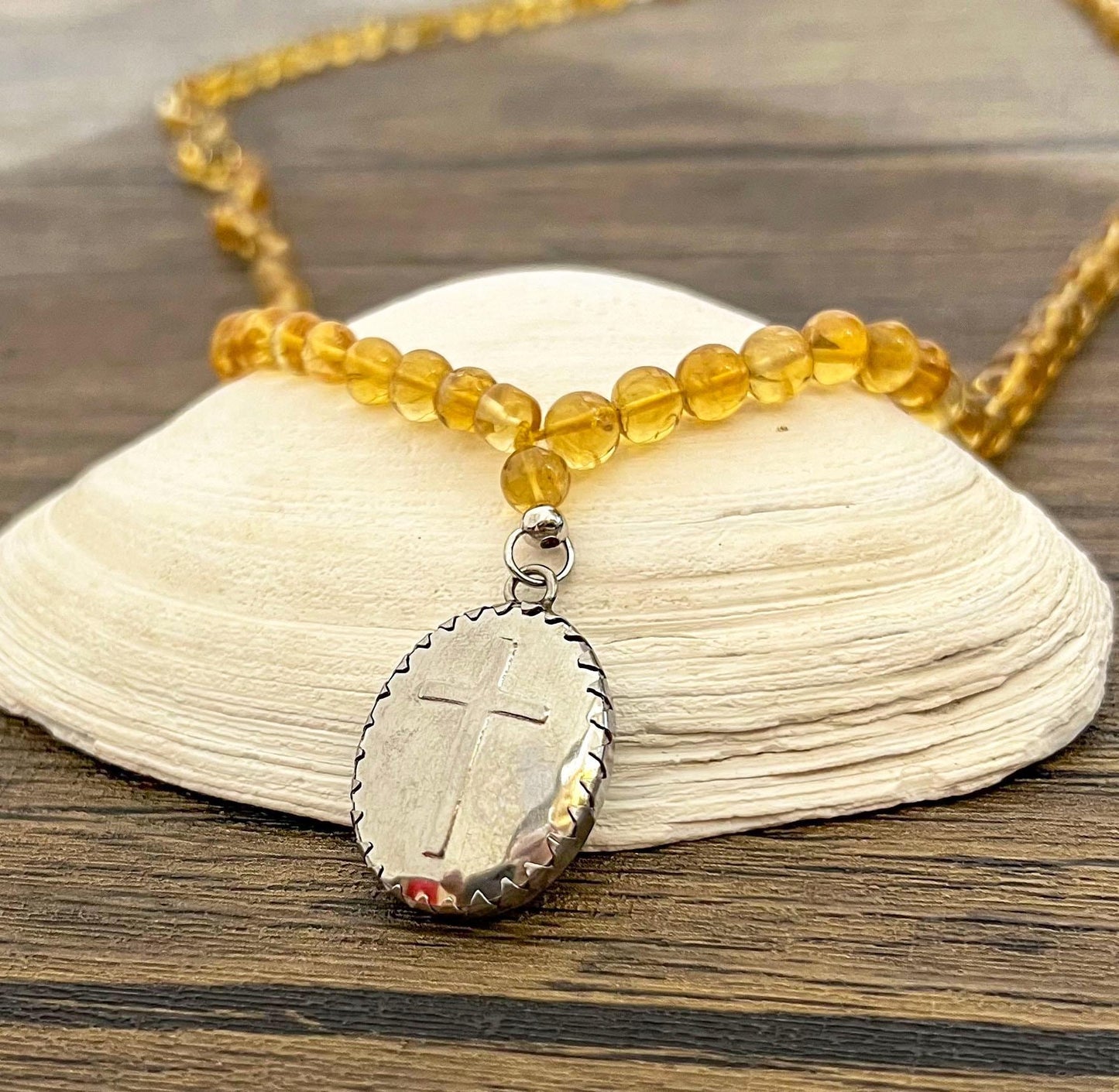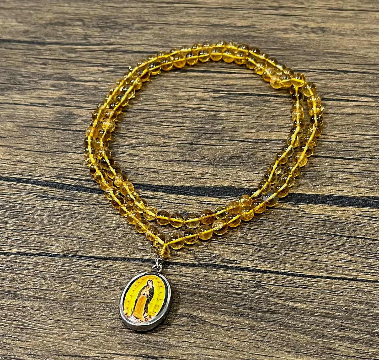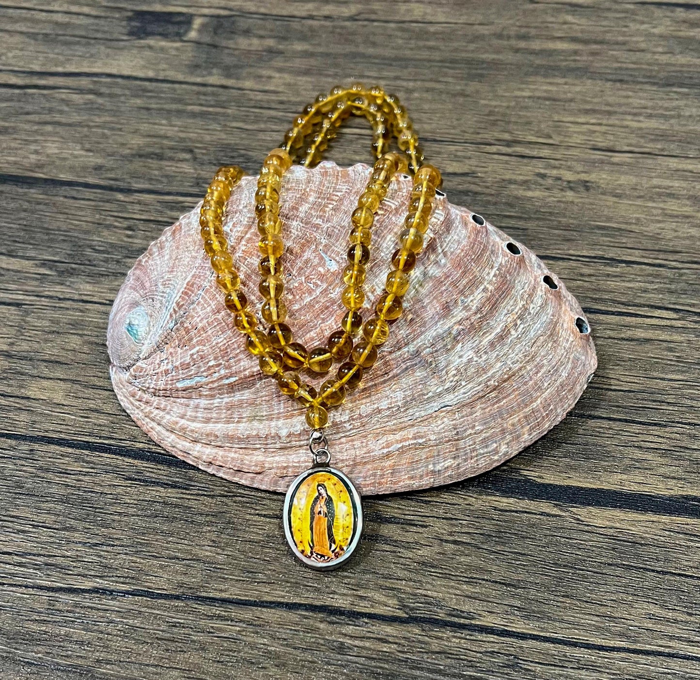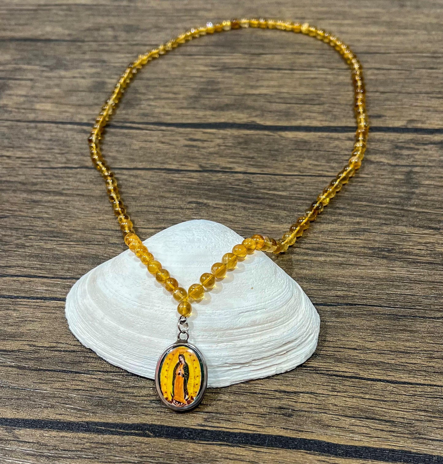 31" Long - This handmade necklace features a vibrant Our Lady of Guadalupe pendant paired with genuine citrine gemstone beads. The warm golden tones of citrine add a joyful, uplifting energy to this meaningful piece. This spiritual piece is perfect for daily wear, prayer, or as a thoughtful spiritual gift.