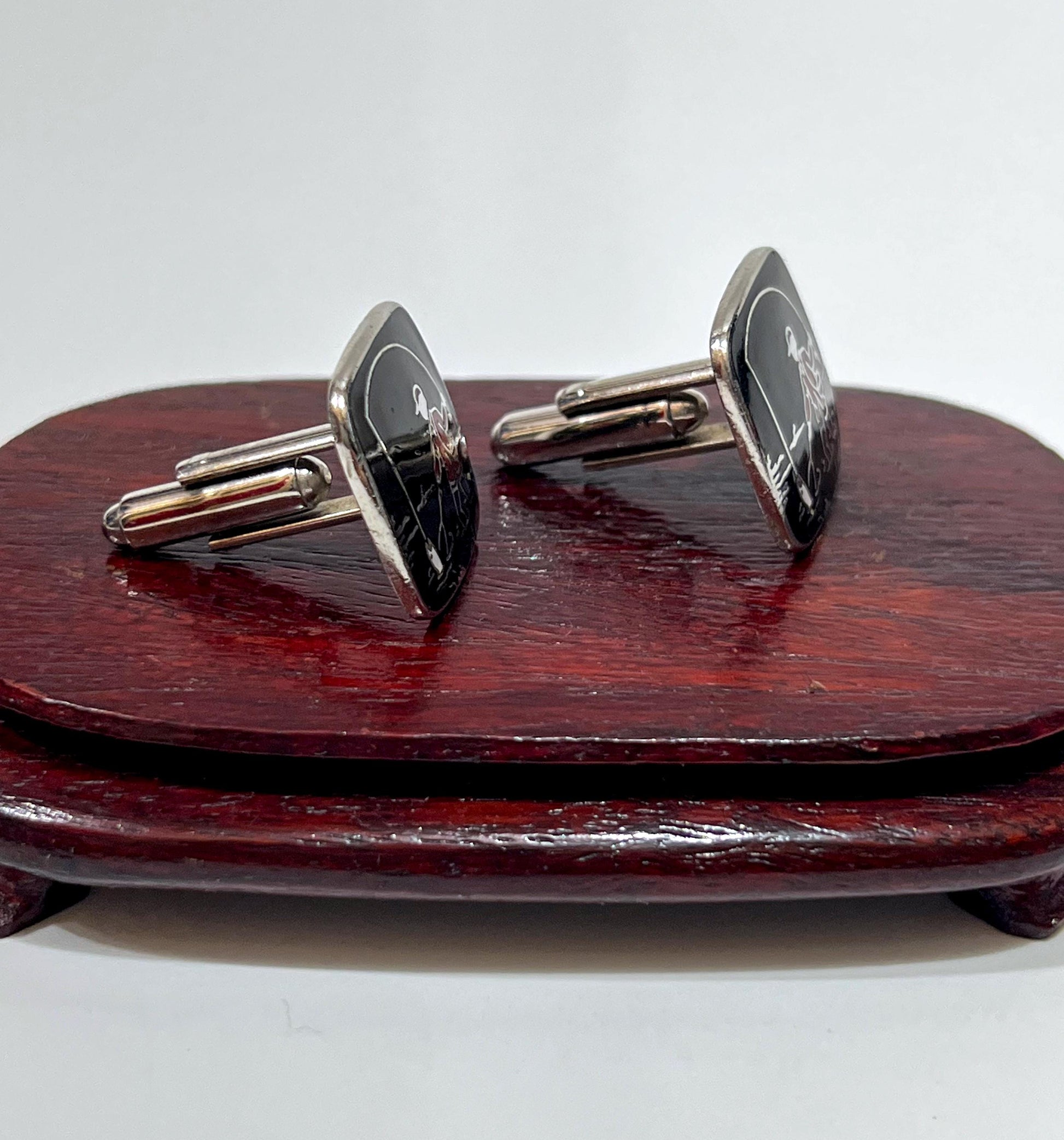 A vintage cufflinks and tie clip set featuring a classic angler scene in black enamel with red accents, set in silver tone. Clean, well-balanced design with a subtle mid-century feel. Very good vintage condition with light wear; cufflinks and clip function as they should.