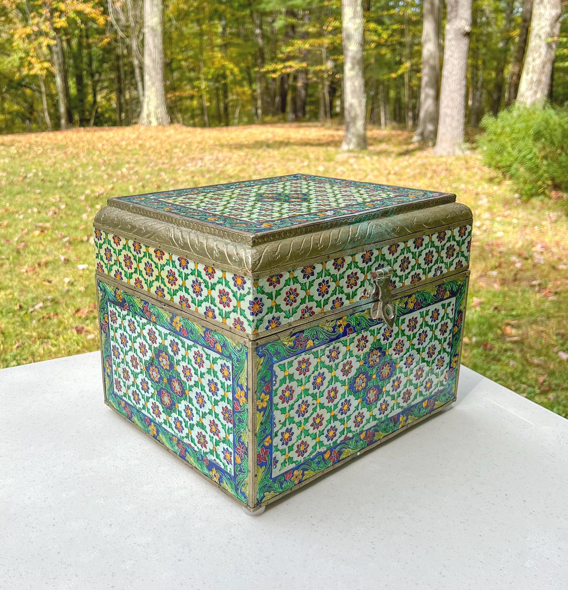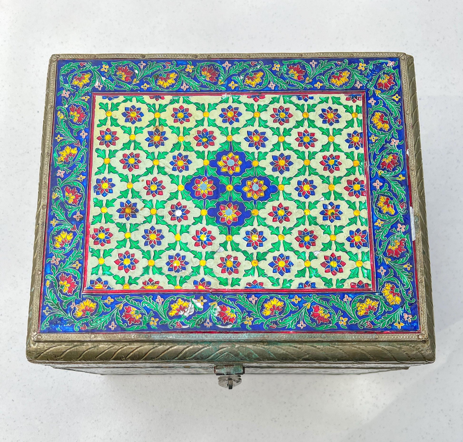A beautiful handmade Meenakari chest, richly decorated with vibrant floral enamel work on a brass base. Each panel is adorned with intricate patterns inspired by traditional Indian artistry, creating a radiant mosaic of color and detail.