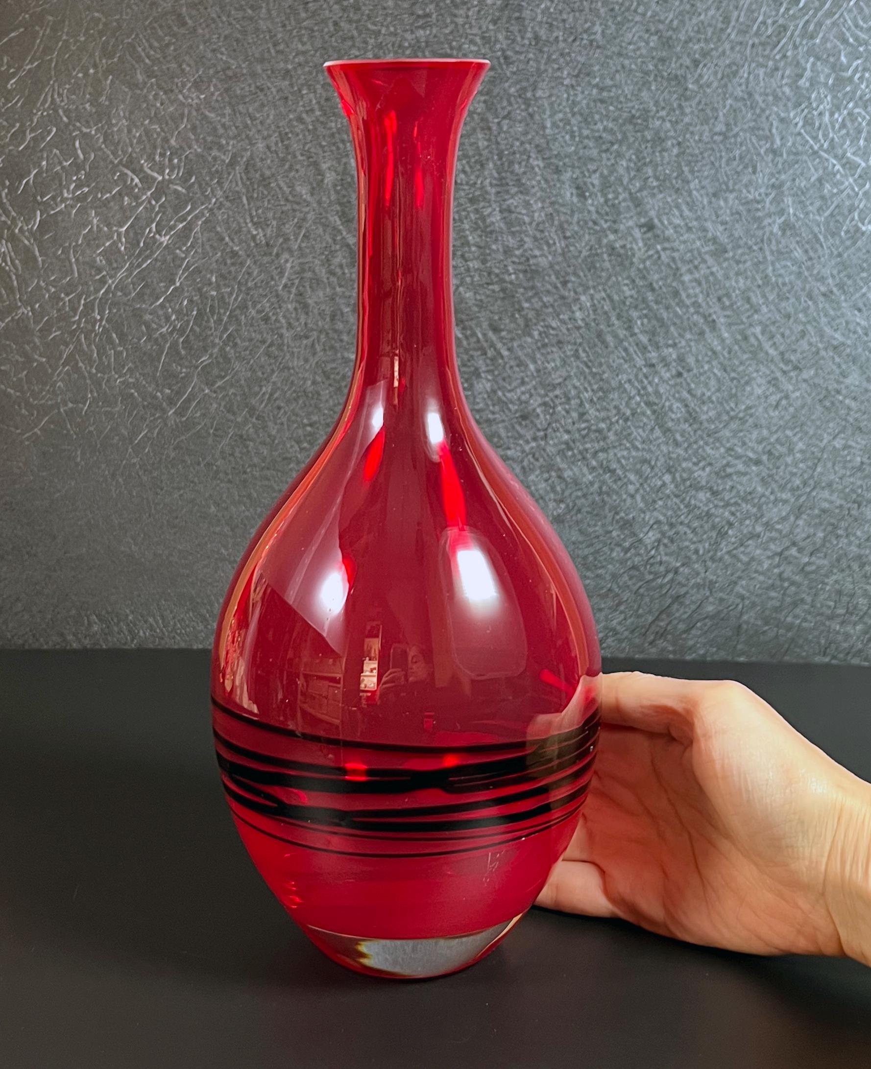 Vintage studio art elongated narrow neck tall glass vase in translucent red with horizontal black thread decoration encircling the body reflecting refined hand-blown craftsmanship.