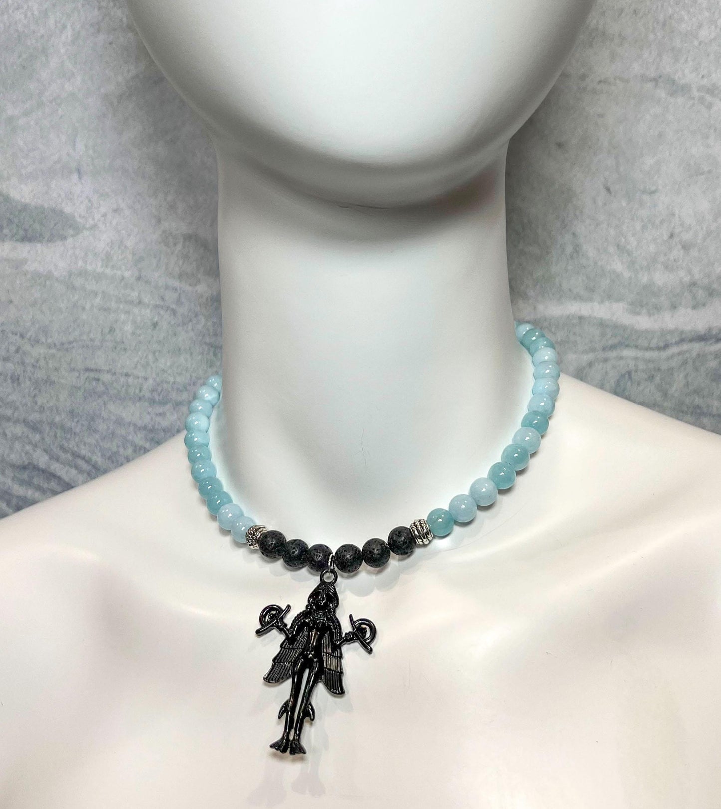 This handmade, one of a kind, Lilith necklace features a genuine Aquamarine gemstone, a stone of balance, communication, and healing. Inspired by Mesopotamian mythology, Lilith symbolizes strength, feminine power, and rebellion against limitations.