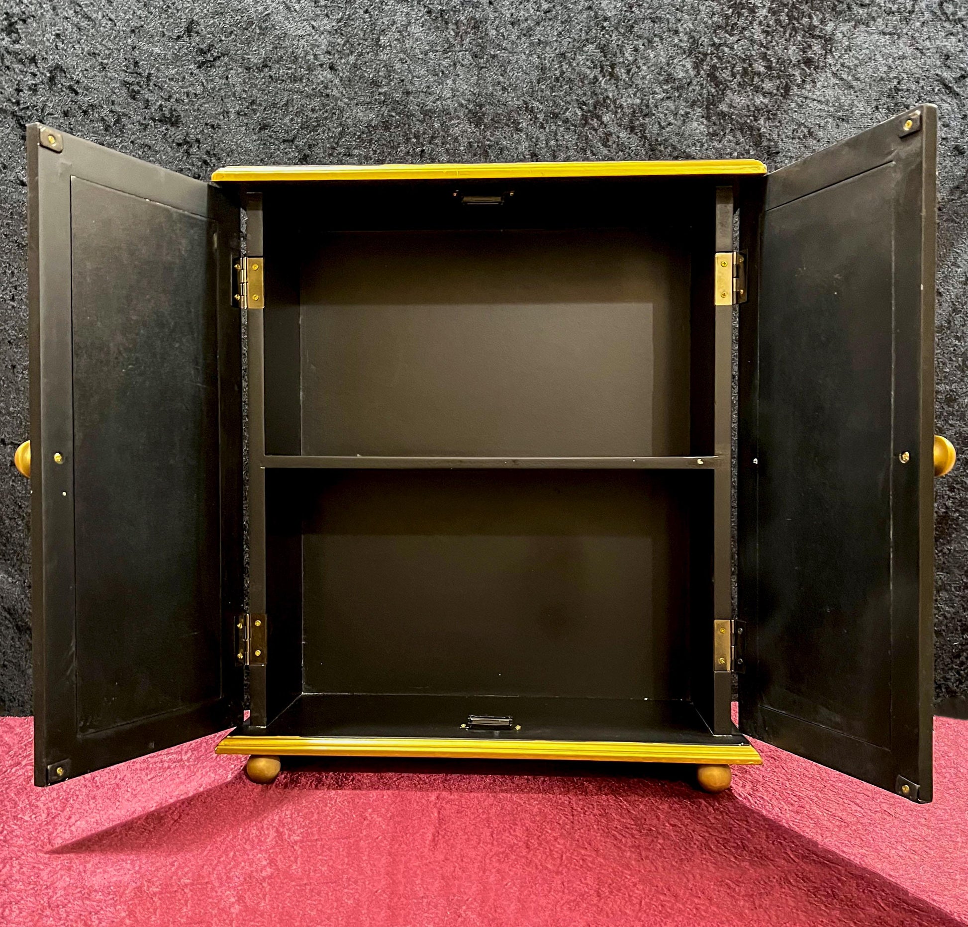 This is a lovely vintage decorative black lacquered wooden cabinet or shrine-style box, embellished with traditional gold Chinese calligraphy and accents featuring a popular expression during Lunar New Year, wishing others success and abundance. Perfect for altar, feng shui decor, or Lunar New Year gift. Two-door design with gold trim and knobs.