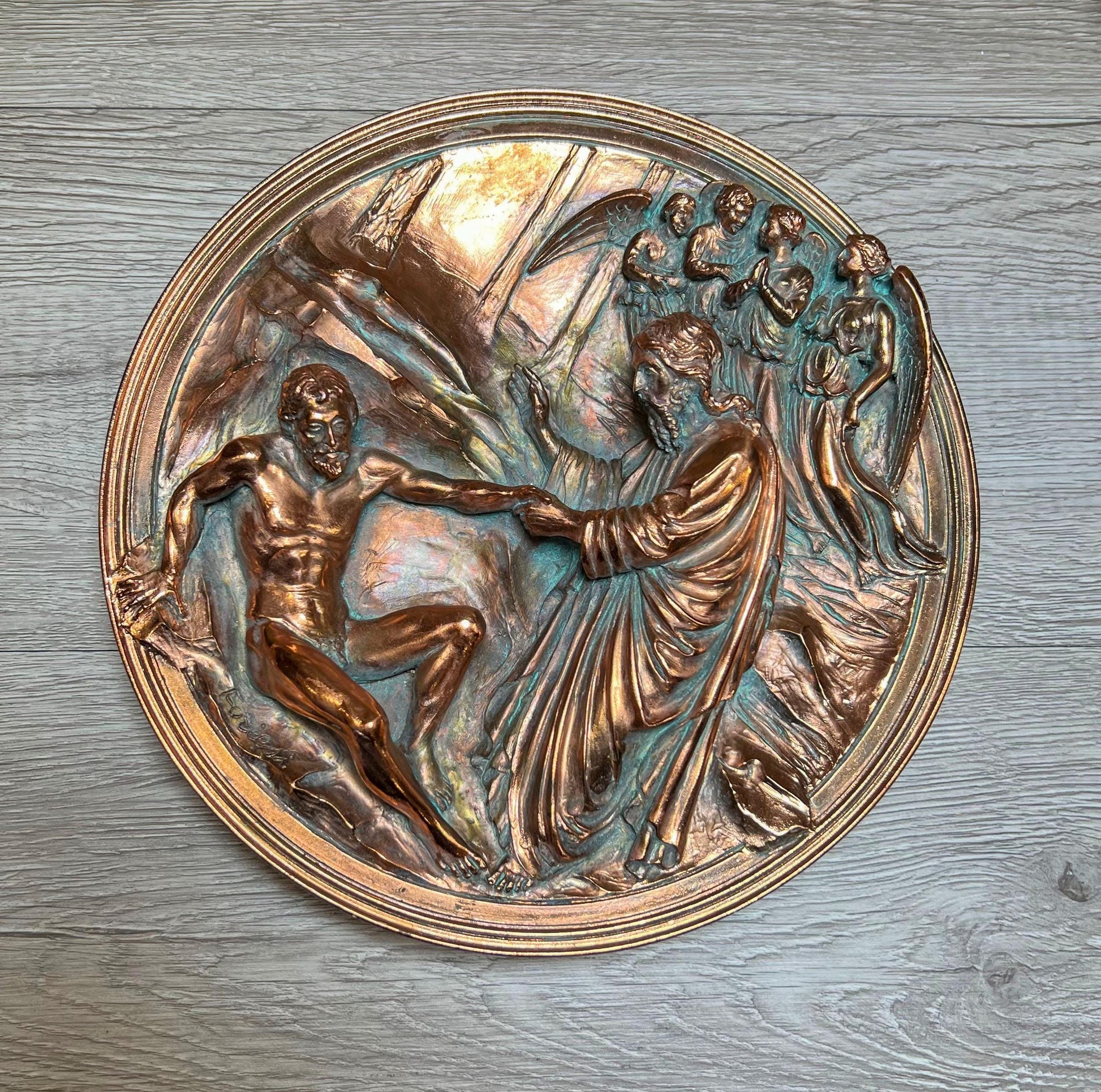 This is a wonderful vintage 1989 collector plate wall hanging designed and produced by Studio Dante di Volteradici in Tuscany, Italy Created by Ennio Furiesi based on the panel "The Creation of Adam" Clad in genuine Florentine bronze. 8 1/2" in diameter and nearly 2" deep at the thickest point, it weighs nearly 2 1/2 lbs.