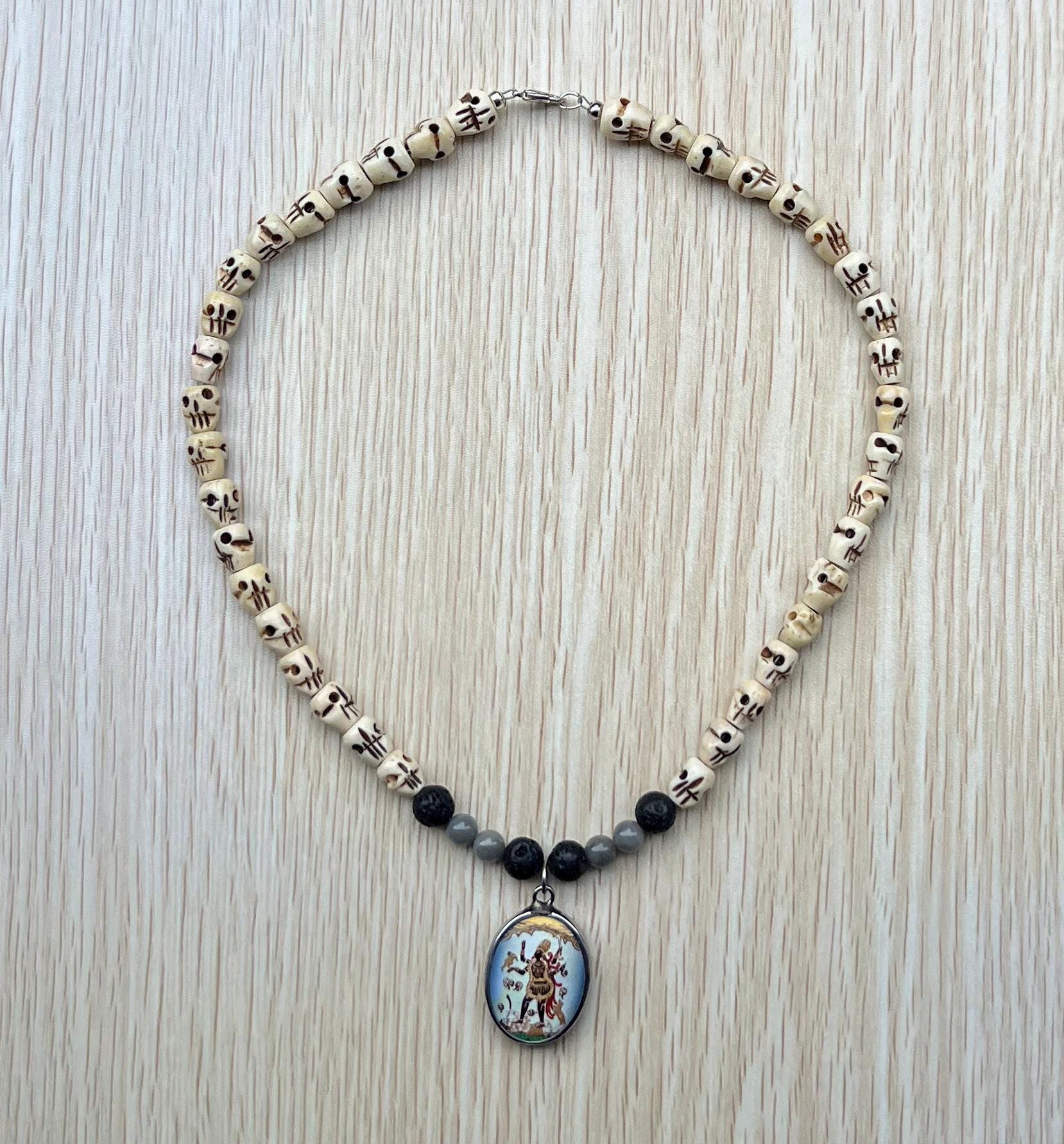17.5" Long - This is A One Of A Kind Hindusim Goddess Kali Maa Skull Carved Skull-shaped, Grey Moonstone, and Lava-stone Beads Pendant Necklace with Lobster Claw Clasp. The Ceramic Image Pendant Is Double Sided with Om on Its Back. We Made This Necklace As A Unique Gift Option. 🤍