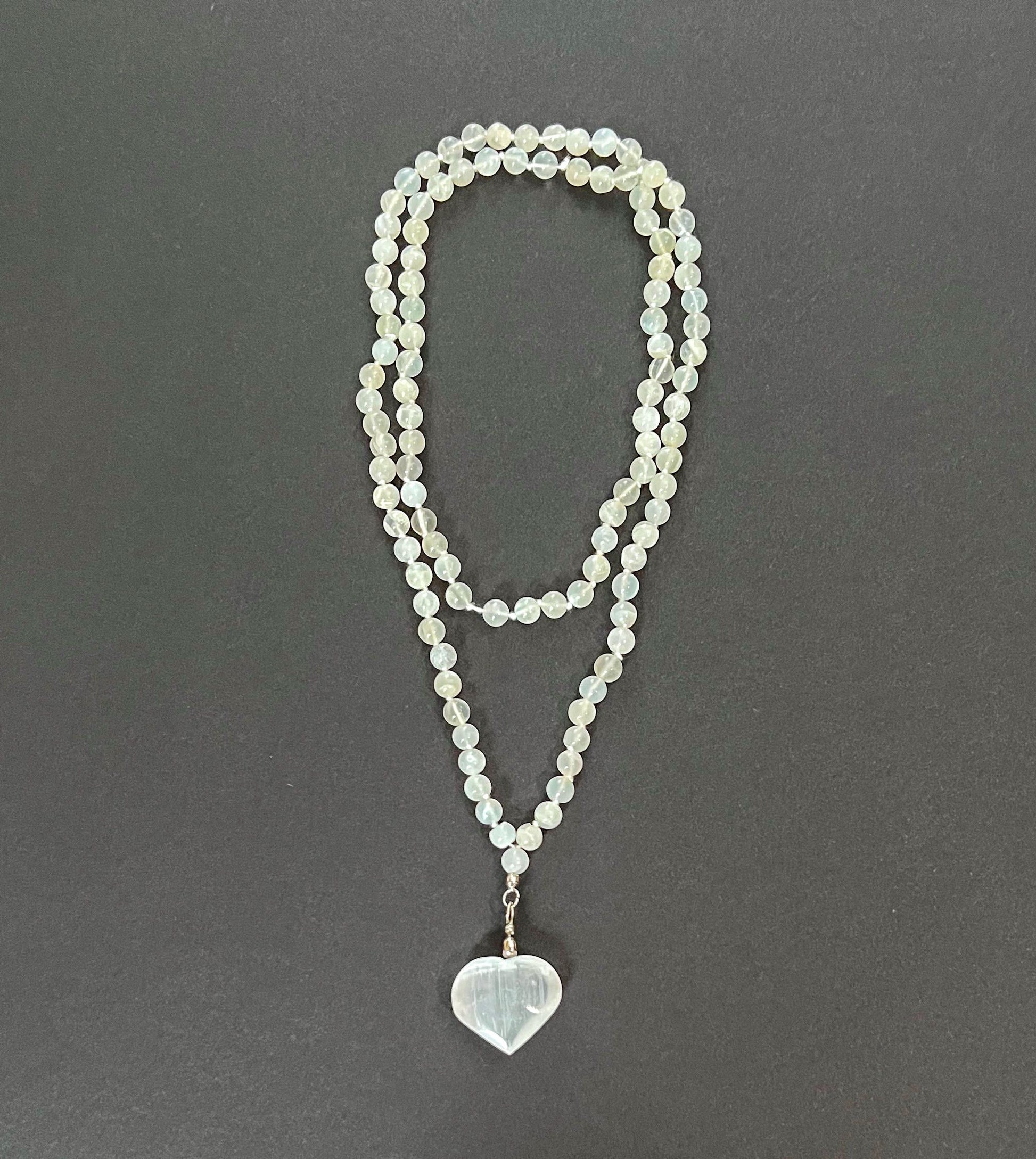 This 32" long handmade with love mala necklace is crafted with moonstone beads and finished with a polished selenite heart pendant, combining two powerful crystals of light, healing, and inner peace.