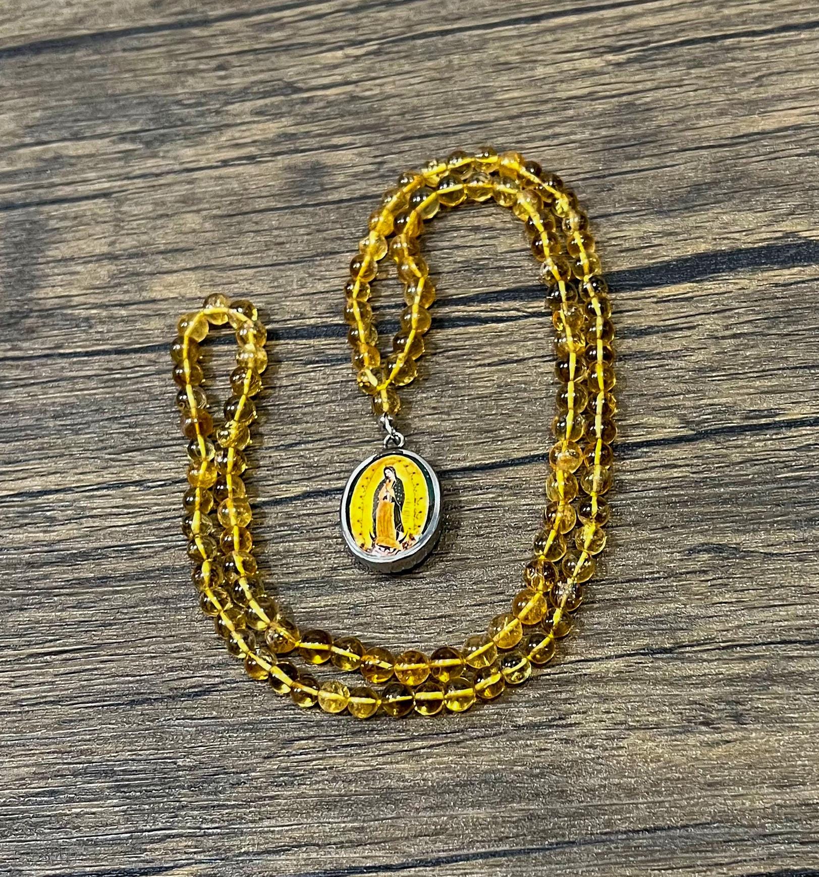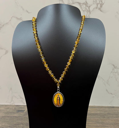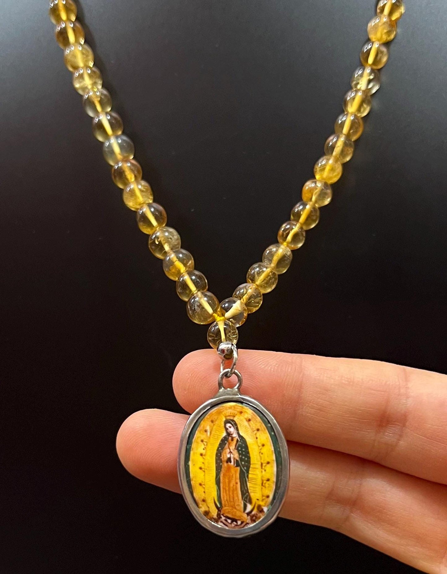 31" Long - This handmade necklace features a vibrant Our Lady of Guadalupe pendant paired with genuine citrine gemstone beads. The warm golden tones of citrine add a joyful, uplifting energy to this meaningful piece. This spiritual piece is perfect for daily wear, prayer, or as a thoughtful spiritual gift.