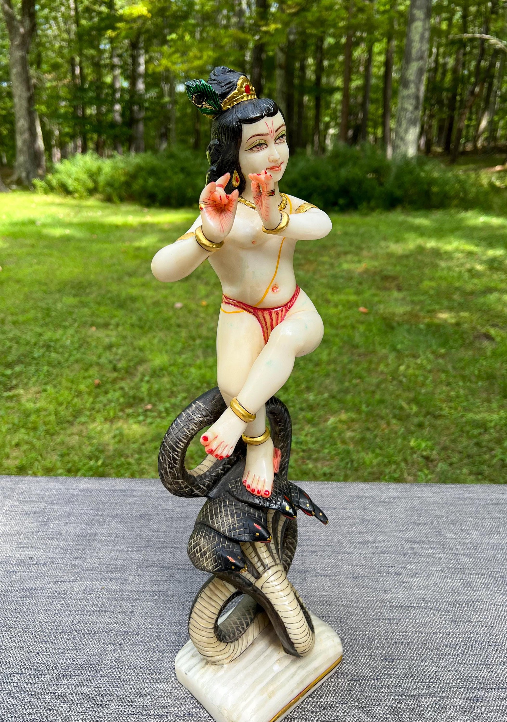 Beautiful Handcrafted Marble Dust Hindu God Lord Krishna Dancing on Serpent Kaliya's Head While Playing His Flute - Comes with flute, dresses, and jewelry.
