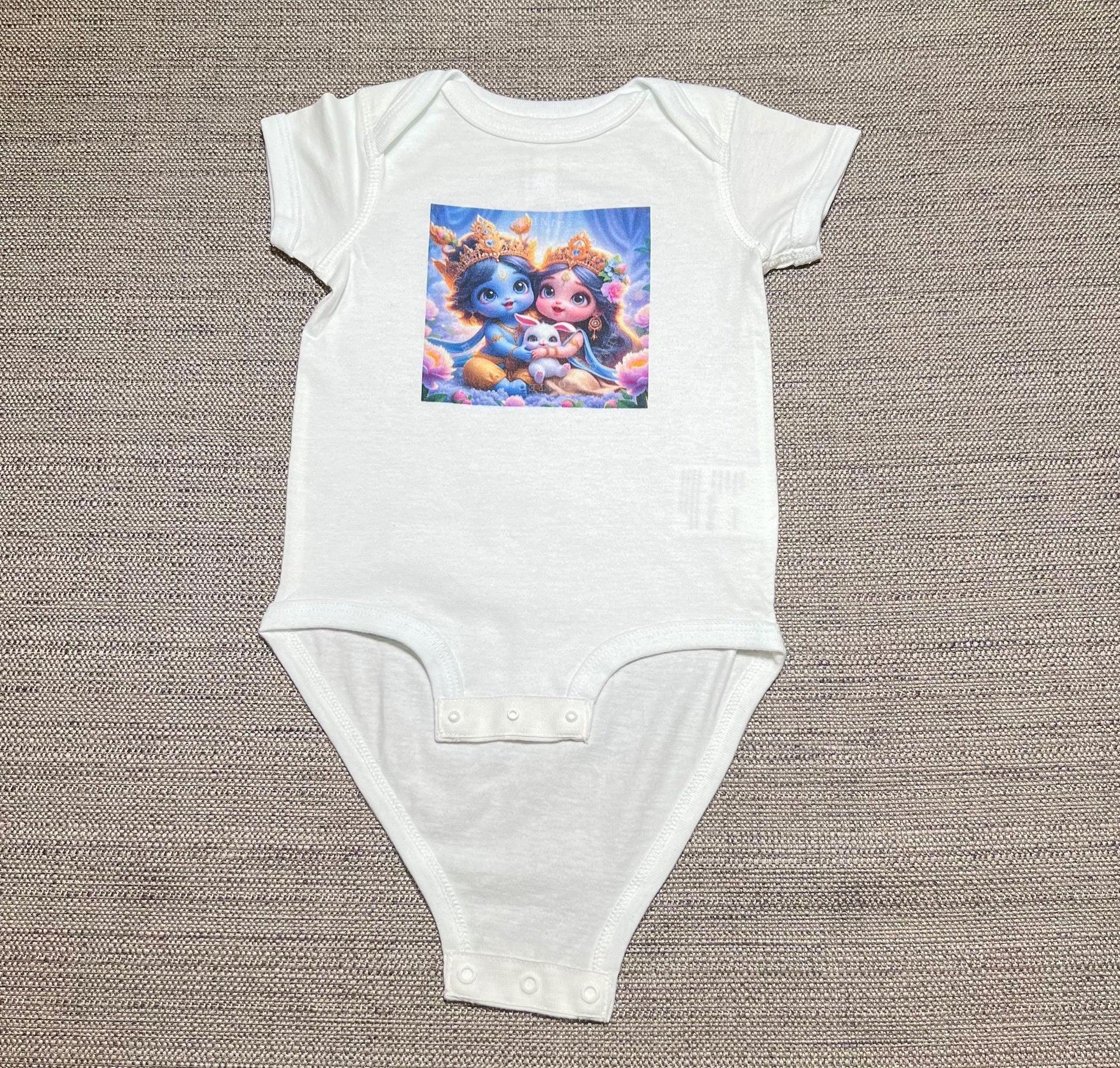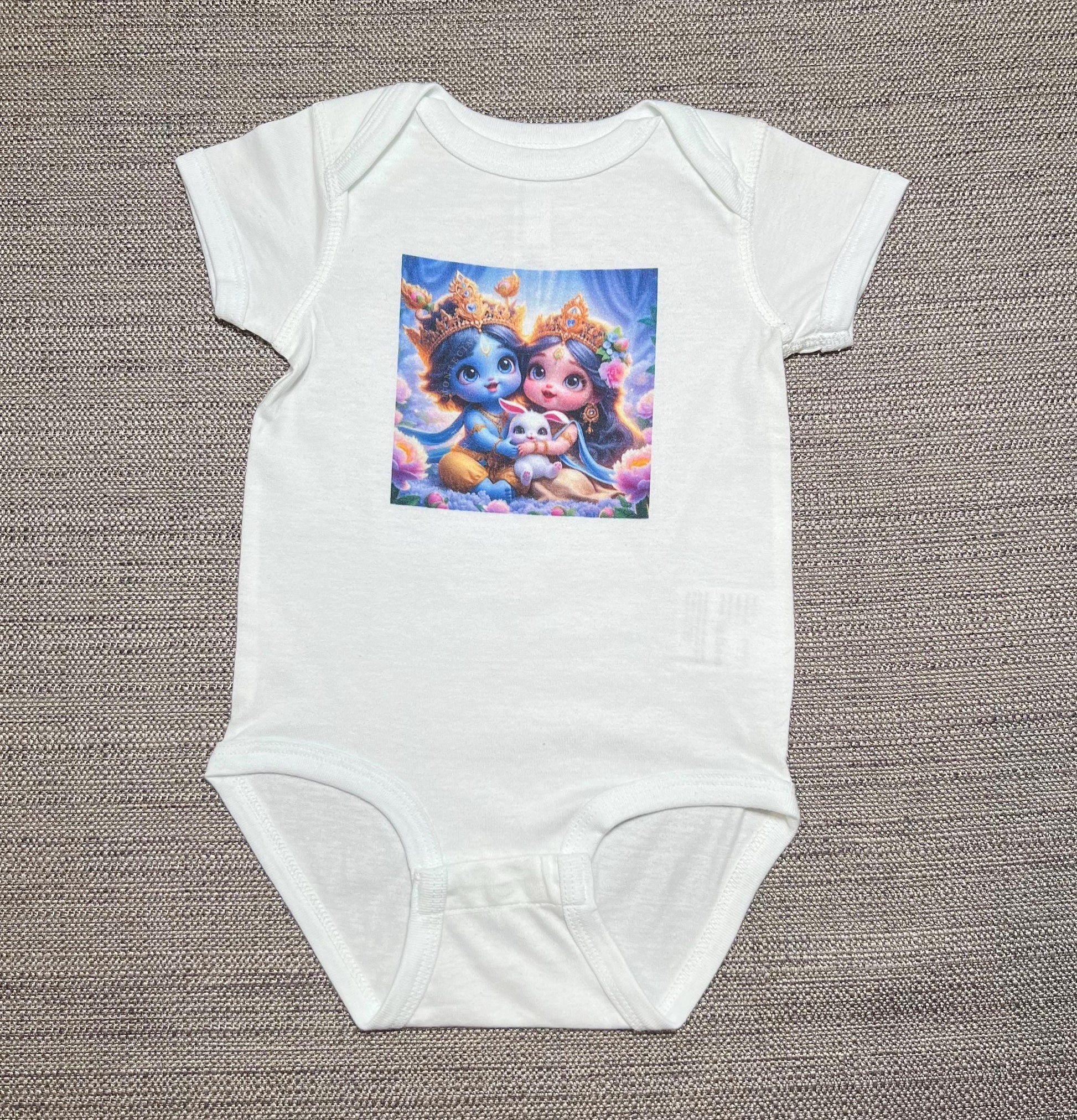 Infuse your baby’s wardrobe with love, comfort, and intention with this Radha Krishna baby bodysuit. Thoughtfully designed to reflect devotion and serenity, this one-of-a-kind infant outfit is perfect for families who appreciate spiritual and devotional imagery. Perfect as a coming home outfit, a baby shower gift, a meaningful first birthday outfit, or simply worn for everyday snuggles, this ultra-soft, breathable cotton onesie carries a gentle, soulful essence — making it a heartfelt choice for spiritual families.