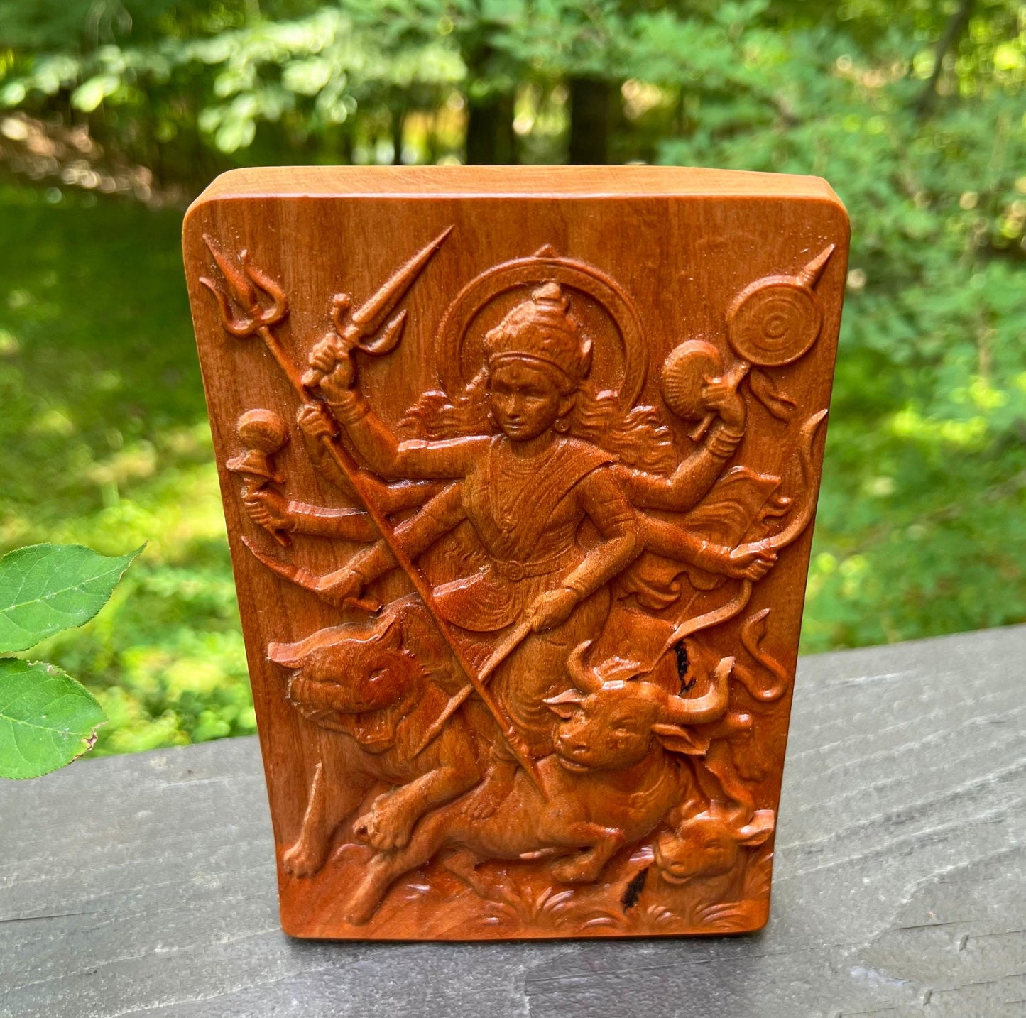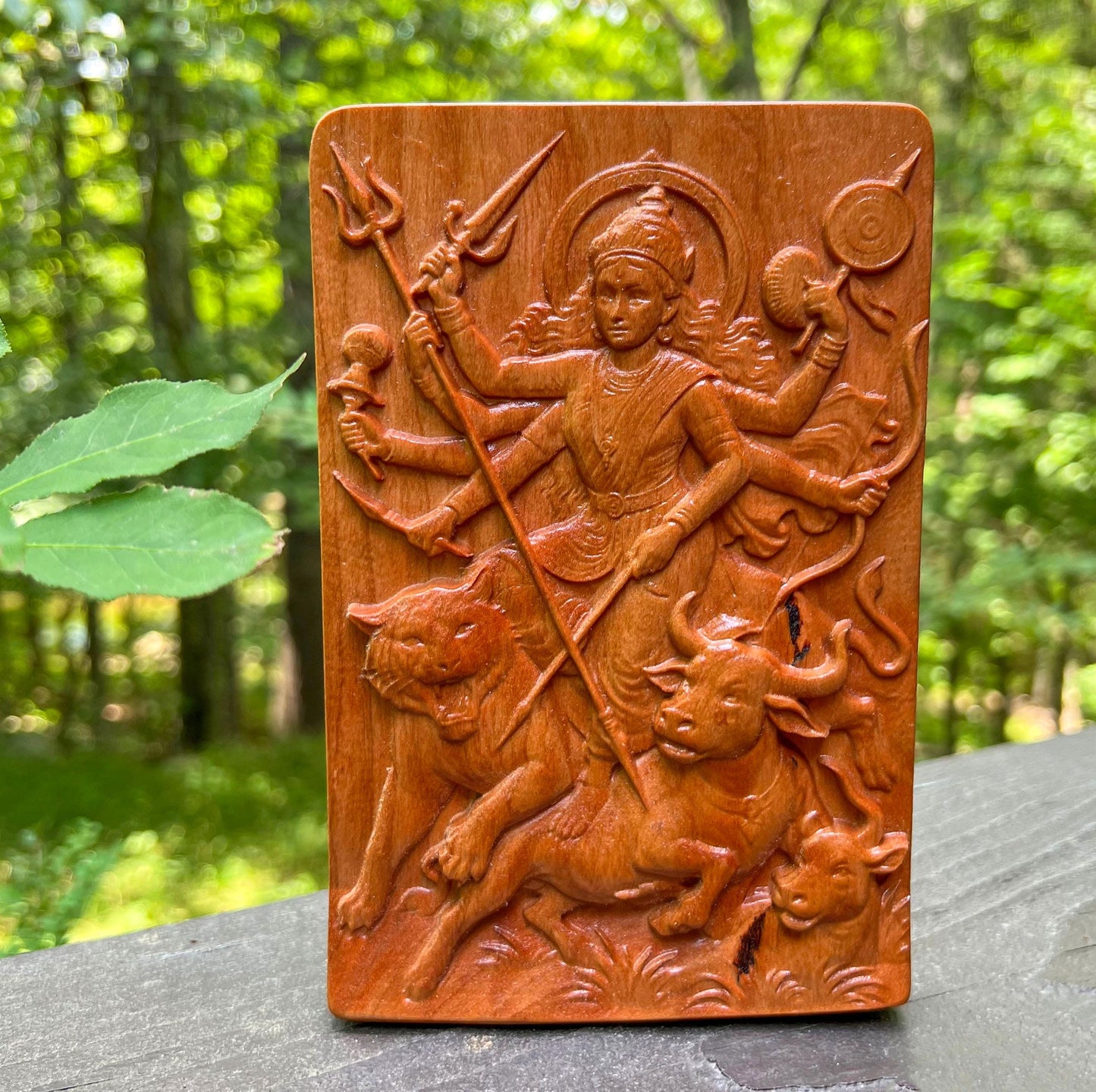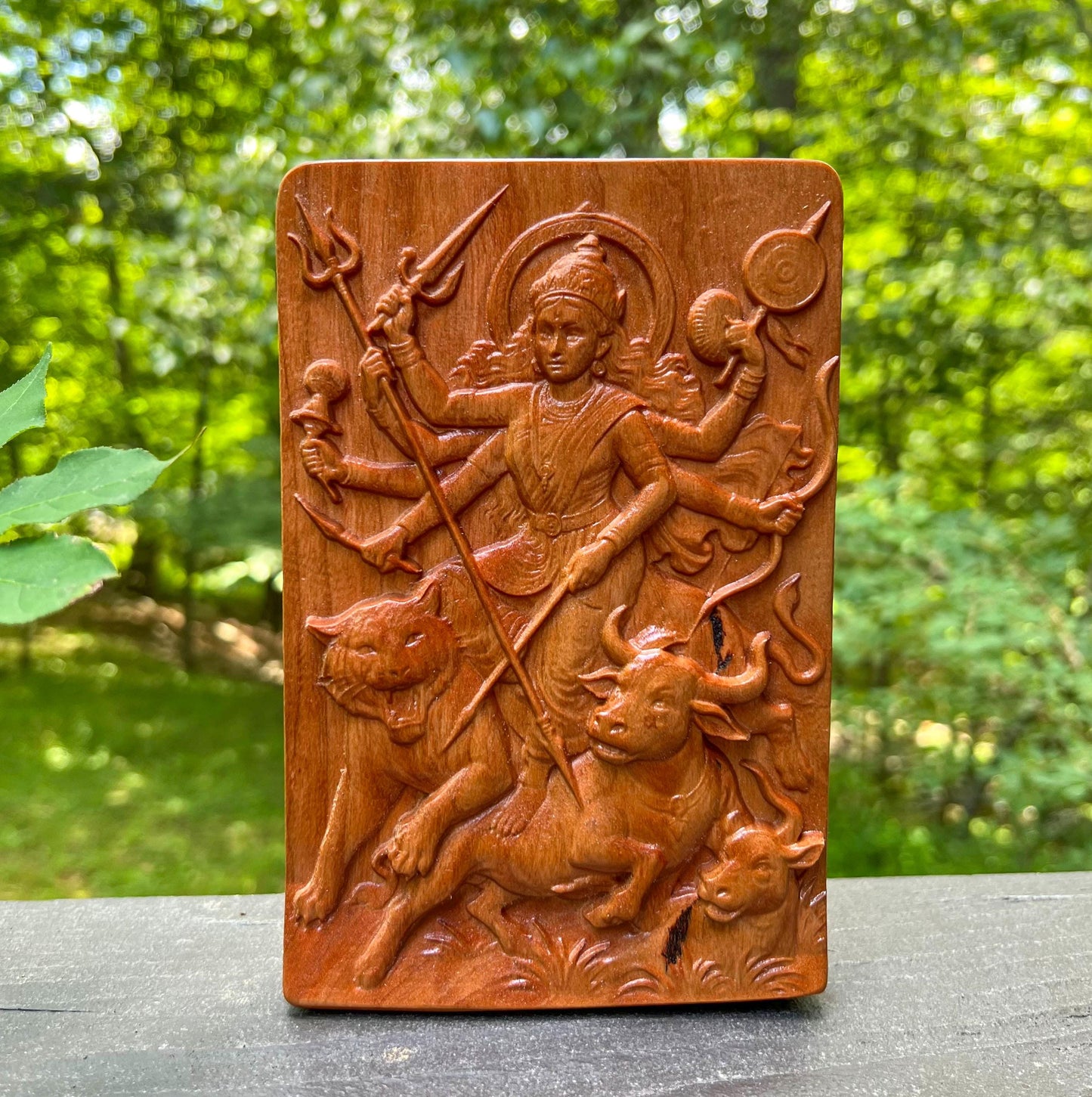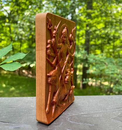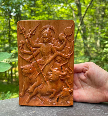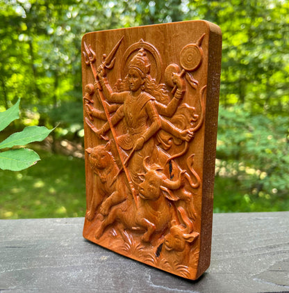 🧡 Celebrate divine strength and sacred beauty with this exquisite carved cherry wood relief of Durga Maa standing in victory over the demon Mahishasura. This intricate wooden panel captures the fierce and graceful form of the Warrior Goddess, riding her lion (or tiger) and triumphing over evil — a powerful symbol of protection, courage, and spiritual awakening.