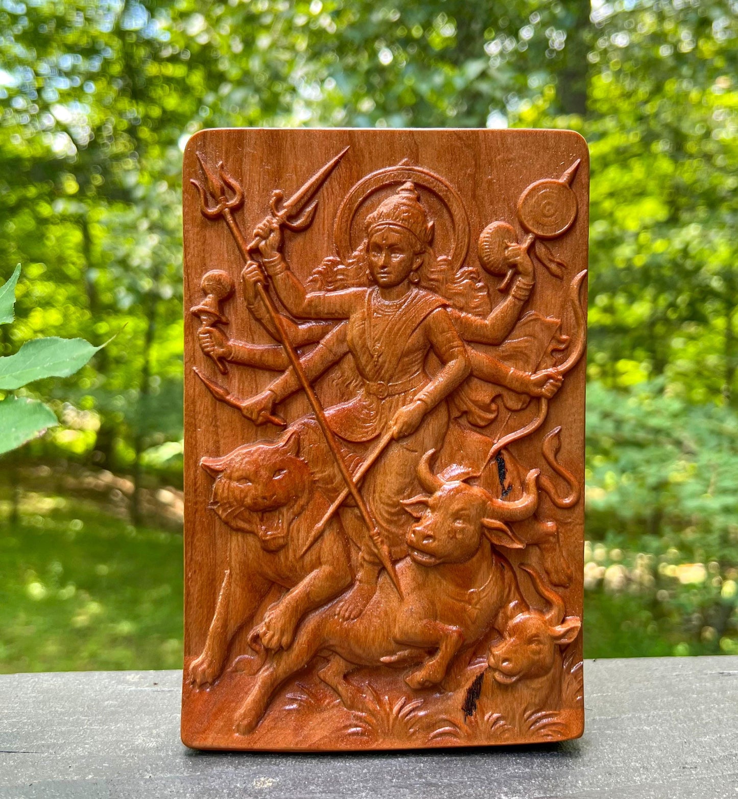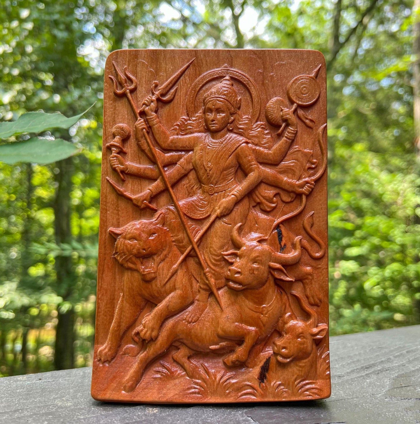Crafted with love and precision, the rich cherry wood enhances every detail of the goddess's flowing garments, multiple arms holding divine weapons, and the fierce expression of divine justice. Perfect for your home altar, meditation space, or wall decor, this unique piece brings sacred energy and artisanal elegance into your environment. 🧡
